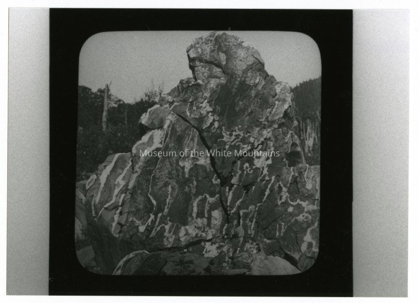 Photograph of a rocky peak in Dixville Notch. Printed from a negative.
