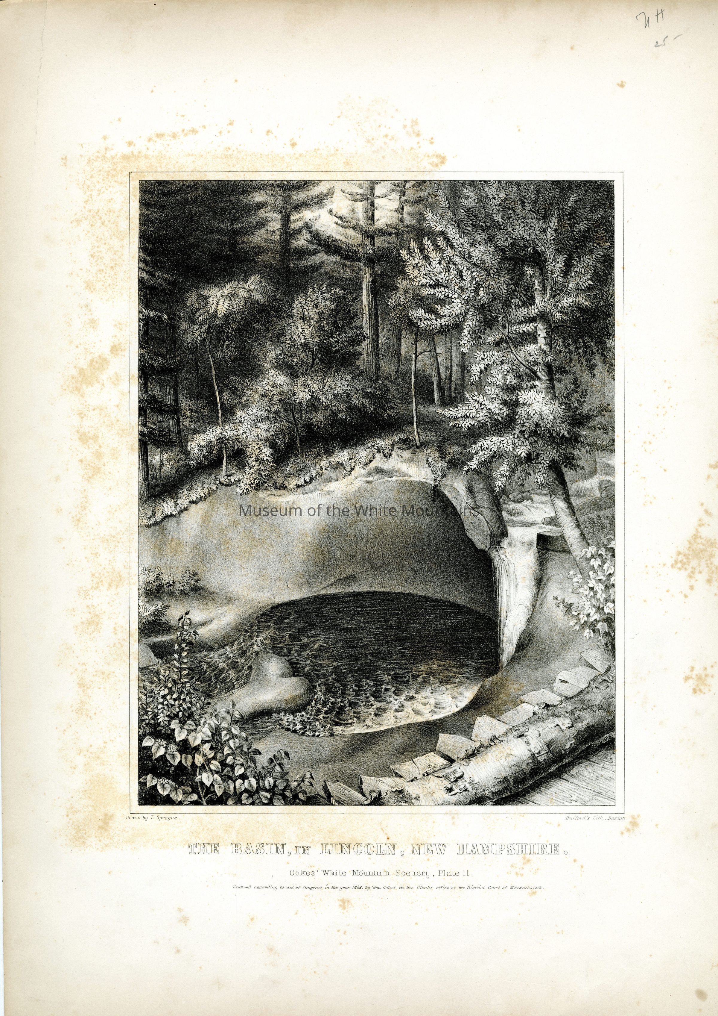 THE BASIN, IN LINCOLN, NEW HAMPSHIRE. / Oake's White Mountain Scenery, Plate 11. / Entered according to act of Congress in the year 1848 by Wm. Oakes in the Clerks office of the District Court of Massachusetts.Language
