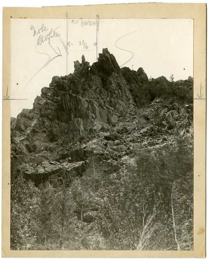 Photograph of a peak in the Dixville Mountain. Photograph includes labels and measurements.