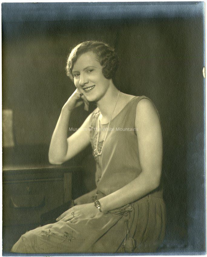 Portrait of a woman in a dress posing with her arm resting on a desk. Possibly a guest entertainer or prominent guest at The Balsams Hotel.