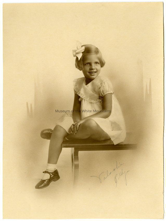 Photograph of a young girl sitting on a bench with a bow in her hair. Possibly a prominent guest at The Balsams Hotel or member of the framily that owned the hotel.