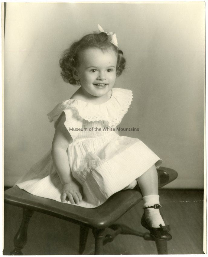 Portrait of a toddler wearing a dress sitting on a stool. Written on the back "July 1st, 1949. 2 yrs old." Possibly a prominent guest at The Balsams Hotel or member of the framily that owned the hotel.