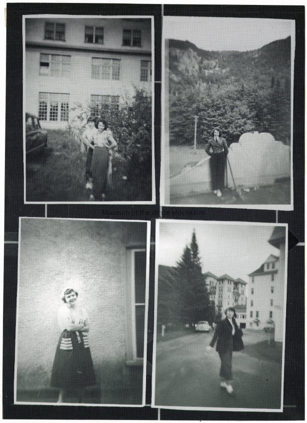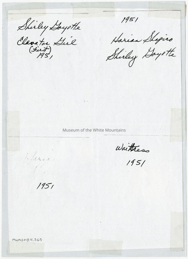 Four photographs of Shirley Goyette, H. Shapiro, a waitress, and "elevator girl" taken at the Balsams Hotel circa 1951.