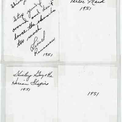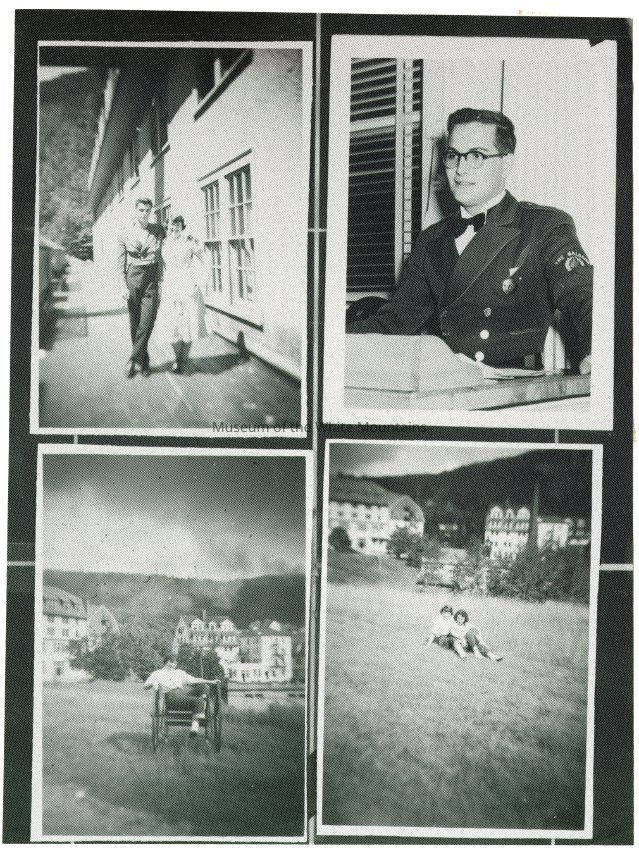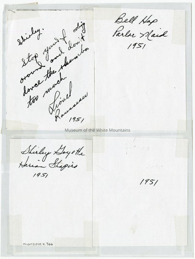 Four photographs taken at the Balsams Hotel circa 1951. Top right is an image of a bell hop and parlor maid, bottom left is an image of Shirley Goyette and H. Shapiro. The other two images are unknown.