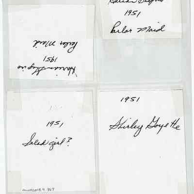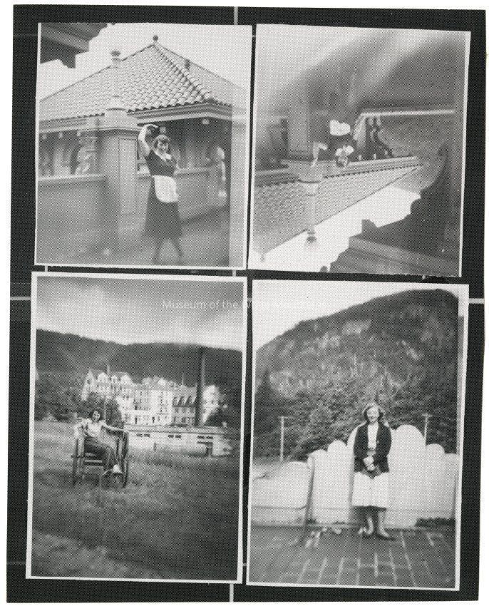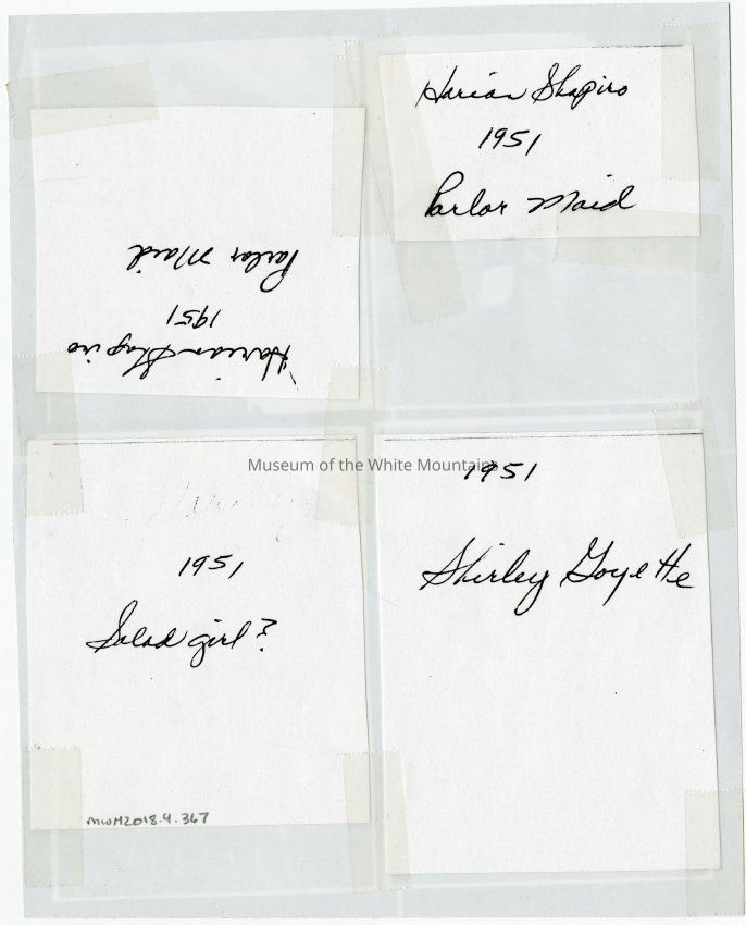 Four photographs taken at the Balsams Hotel circa 1951. The top two images are of Marion Shapiro, parlor maid; in the left image she stands. On the bottom left is a salad girl posing in a field in front of the hotel. On the bottom right is Shirley Goyette.