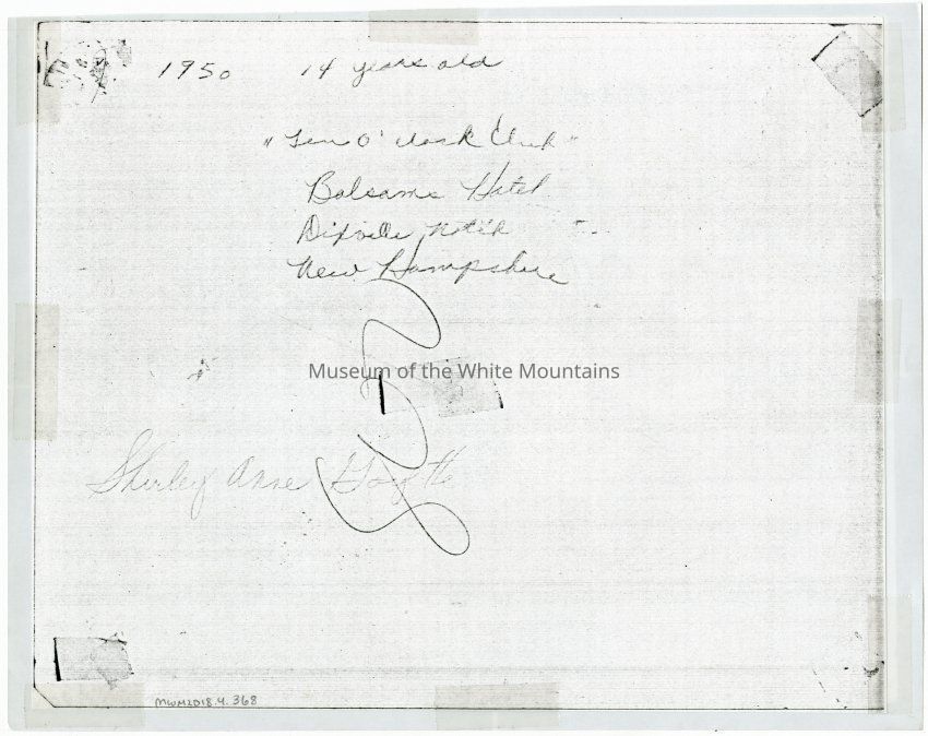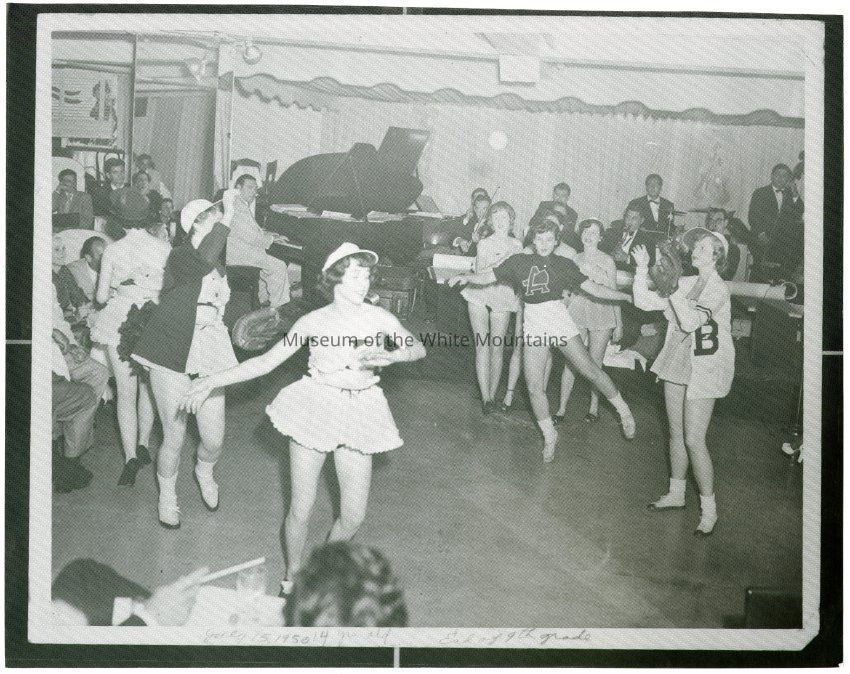 Photograph of people dancing in a room inside the Balsams Hotel circa 1950. The girl in the center of the photo is Shirley Goyette at age 14.