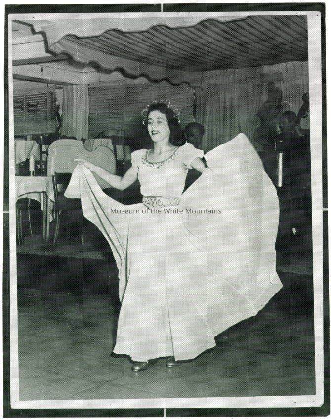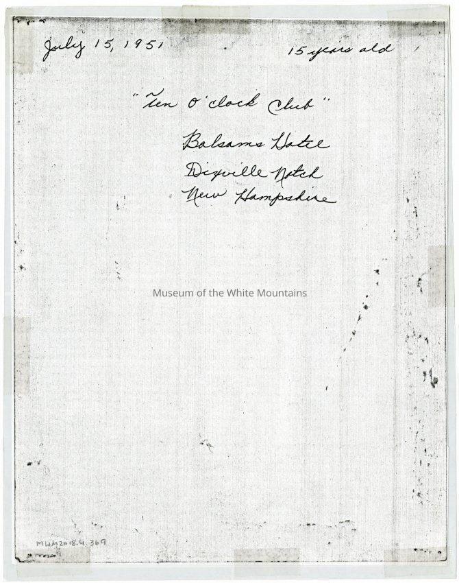 Photograph of Shirley Goyette in a white dress taken at the Balsams Hotel on July 15, 1951. She is 15 years old.