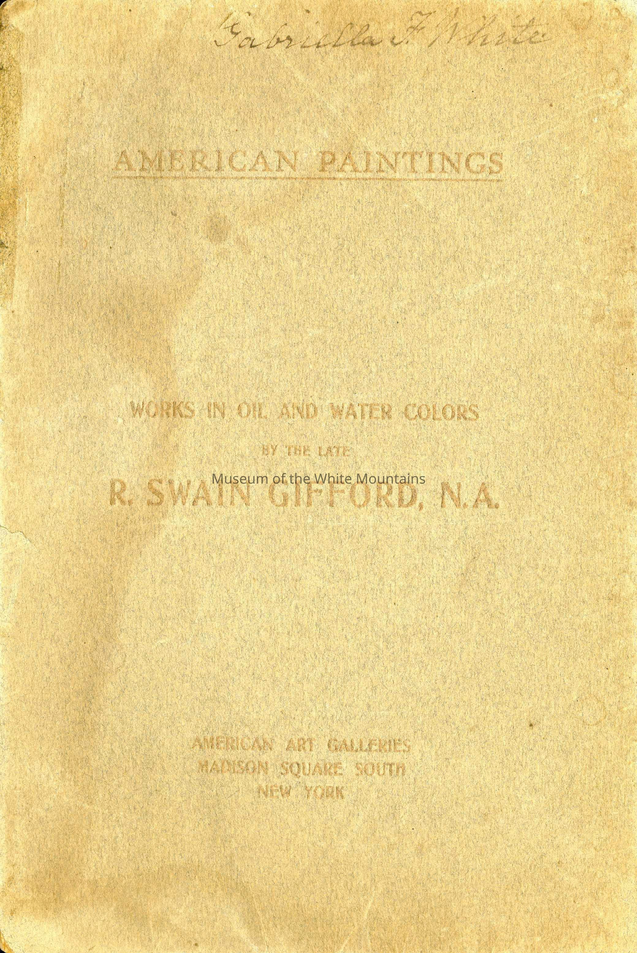 Black-and-white illustrated catalog of oil paintings and water colors, mostly landscapes, by the late Robert Swain Gifford. Gifford was born near New Bedford, MA, and spent his life living and working in New York and Nonquitt, traveling abroad in Euorpe, North Africa, and to Alaska to sketch. Catalog provided for the unrestricted public aution of these works at The American Art Galleries, Madison Square South, on February 2, 1906, by the execurtix of the estate.Collection