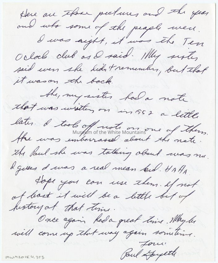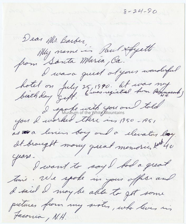 A letter written to Mr. Barba from Paul Goyette. The ltter describes the fond memories he had while working at the Balsams Hotel in the 1950s. References photos: WM202100728 - WM202100742.