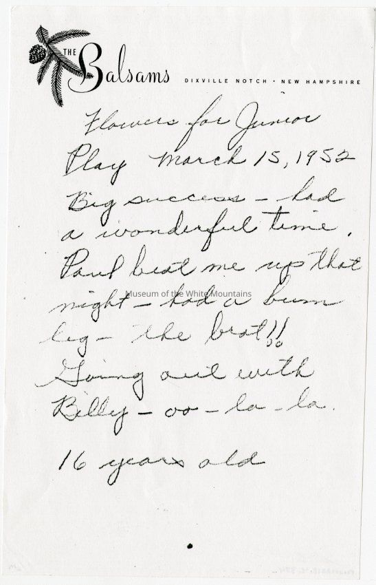 Image of a note describing the success of the junior play on March 15, 1952. Written on paper with a Balsams Hotel letterhead. References photos WM202100728 - WM202100728