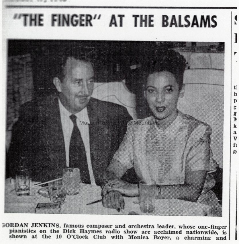 Image of a newspaper clipping showing famous composer Gordan "The Finger" Jenkins at the Balsams Hotel Ten O'Clock Club with Monica Boyer. Xeroxed copy.