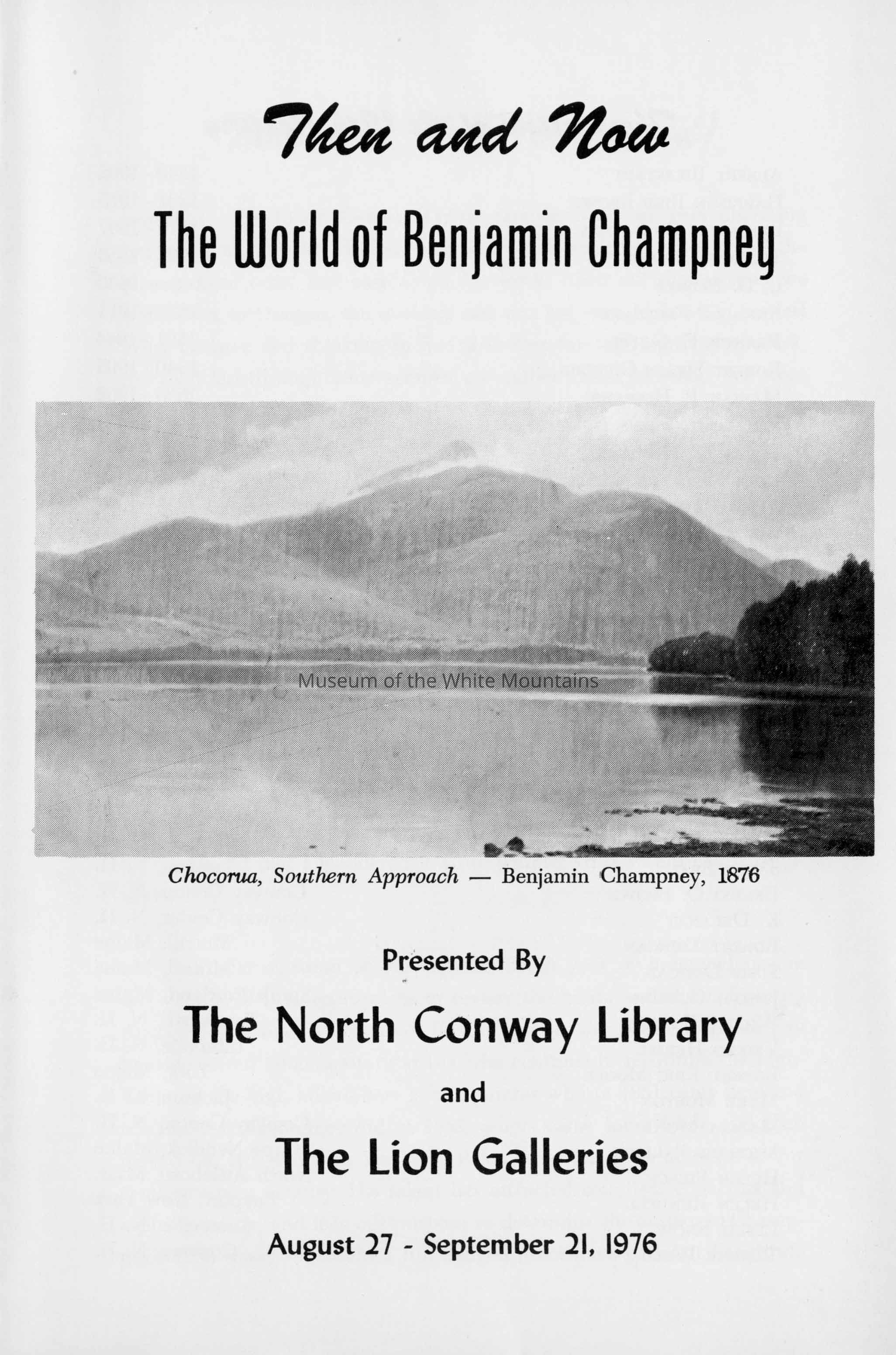 Small catalog from an exhibition presented by the North Conway Library and the Lion Galleries. Includes two lists of artists, from the 19th century and from the 20th century; a short essay about Champney with a concluding paragraph remarking upon contemporary artsits at the time of the country's bicentennial; and a list of lenders. Illustrated with two black-and-white images.