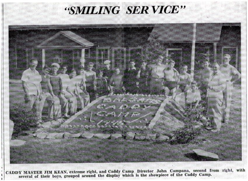 Image of a newspaper clipping showing the Caddy Master, Caddy Camp Director, and several of their boys grouped around the display and showpiece of the Caddy Camp. Xeroxed copy.