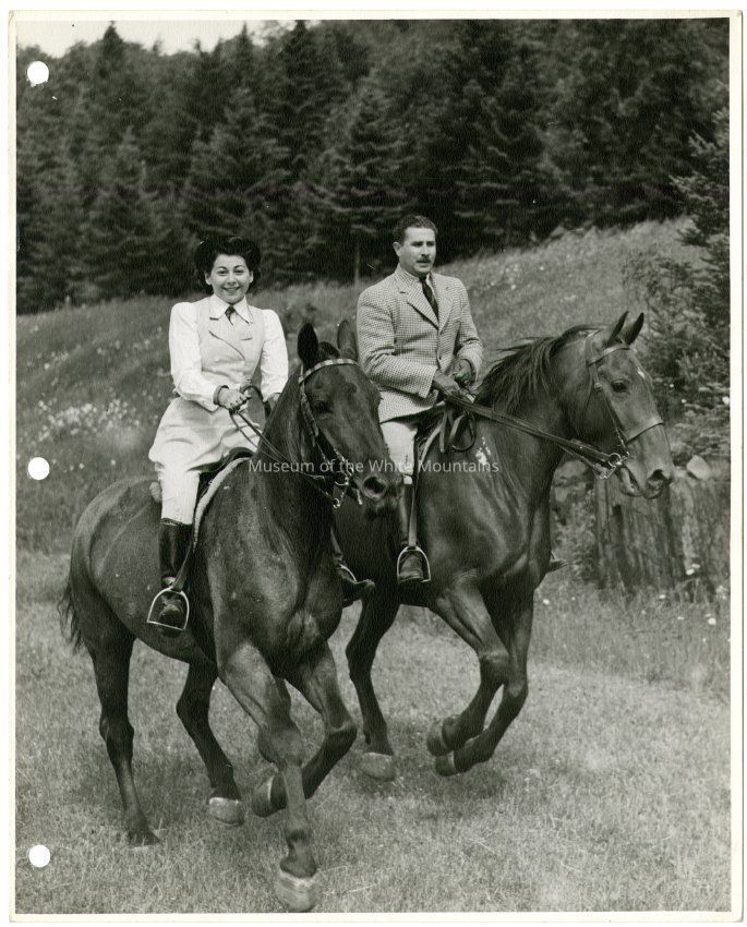 Photograph of a man and a woman horseback riding at the Balsams Hotel. Cornelius Roddy photo.
