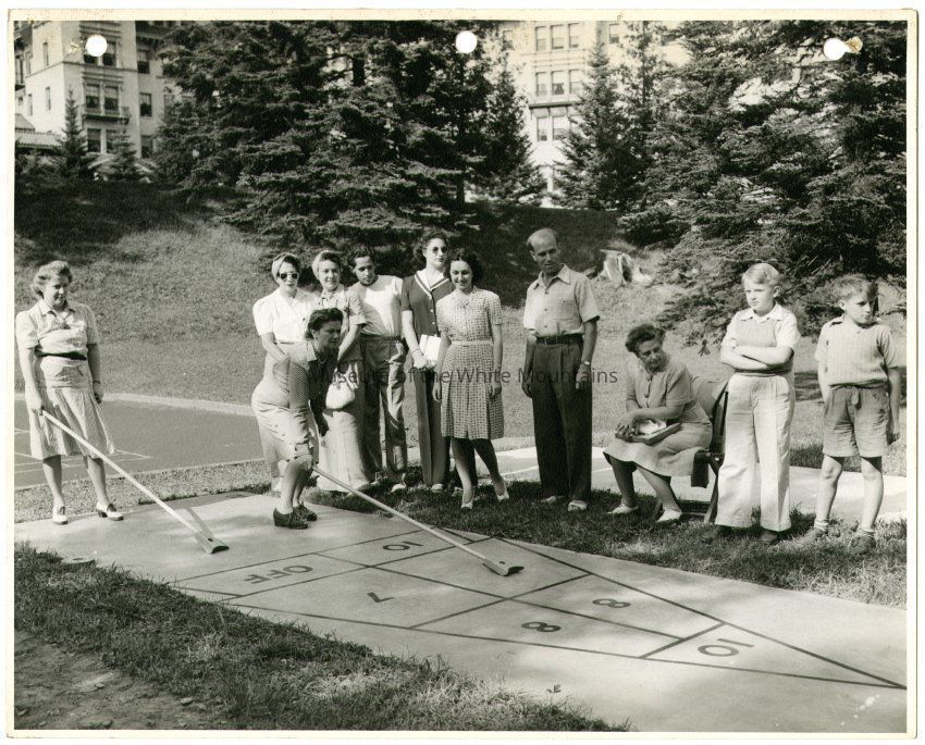 Photograph of a group of children and adults spectating an outdoor game of shuffleboard at the Balsams Hotel. Cornelius Roddy photo.