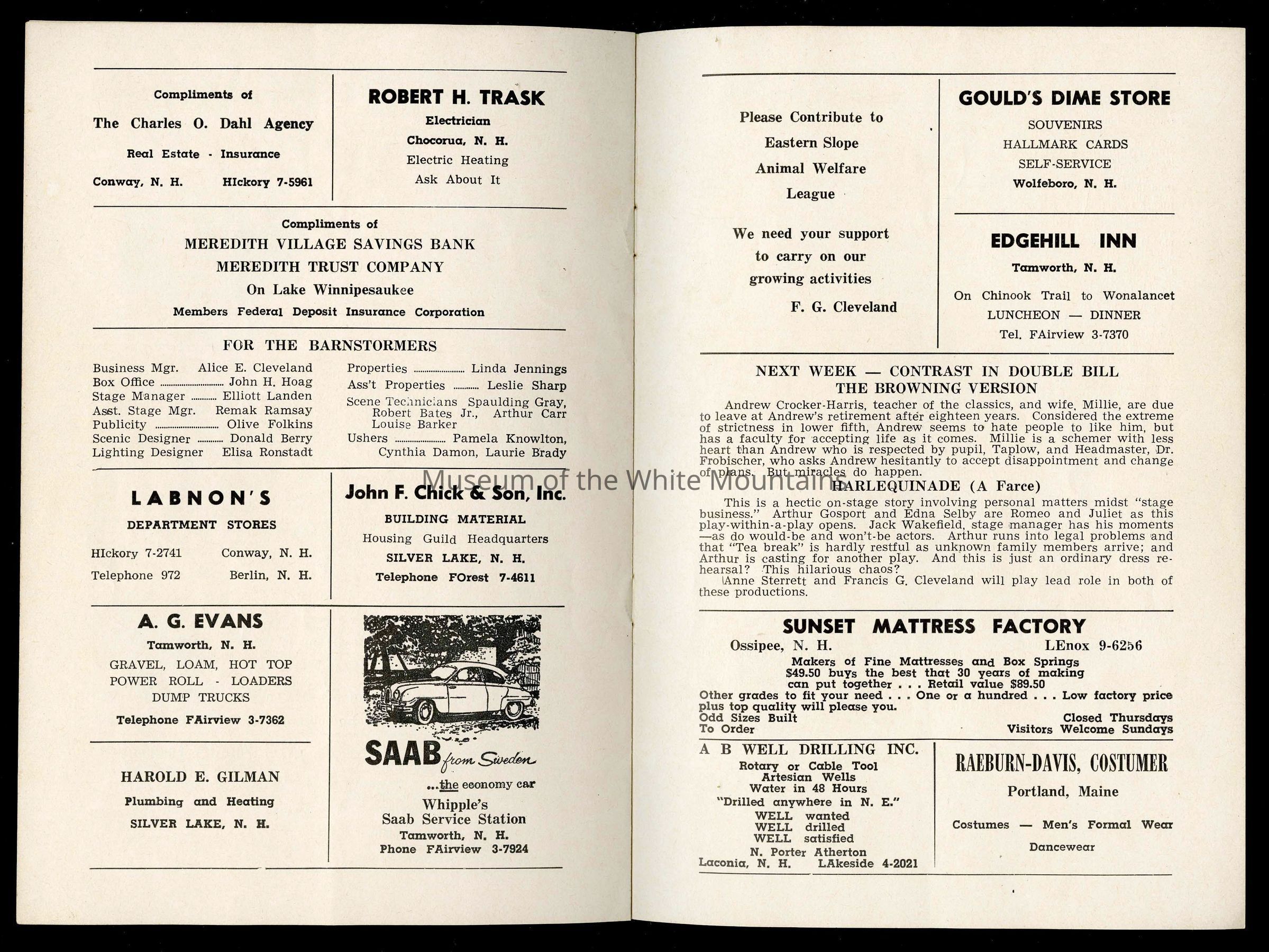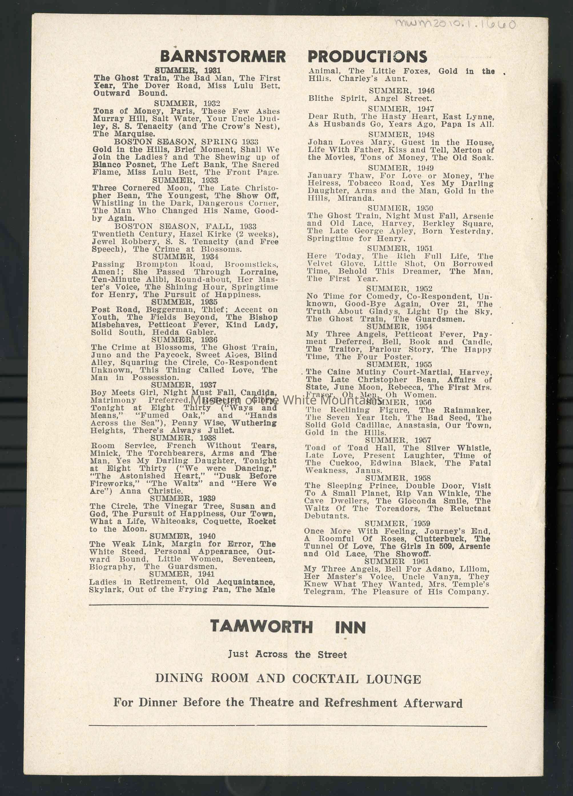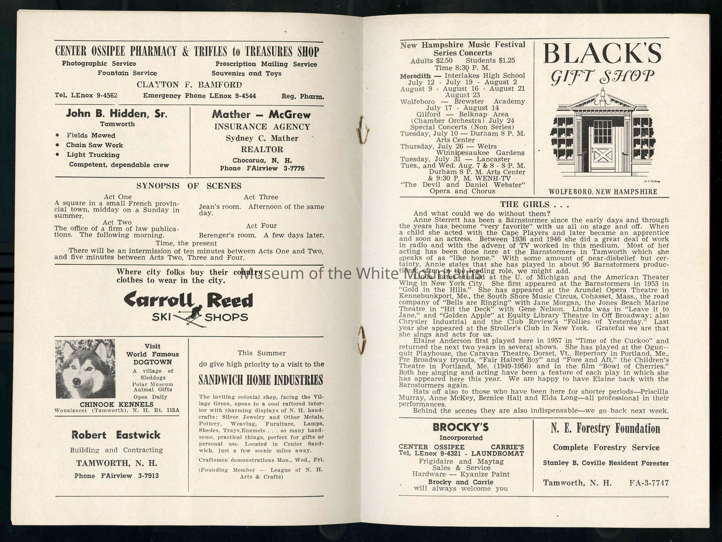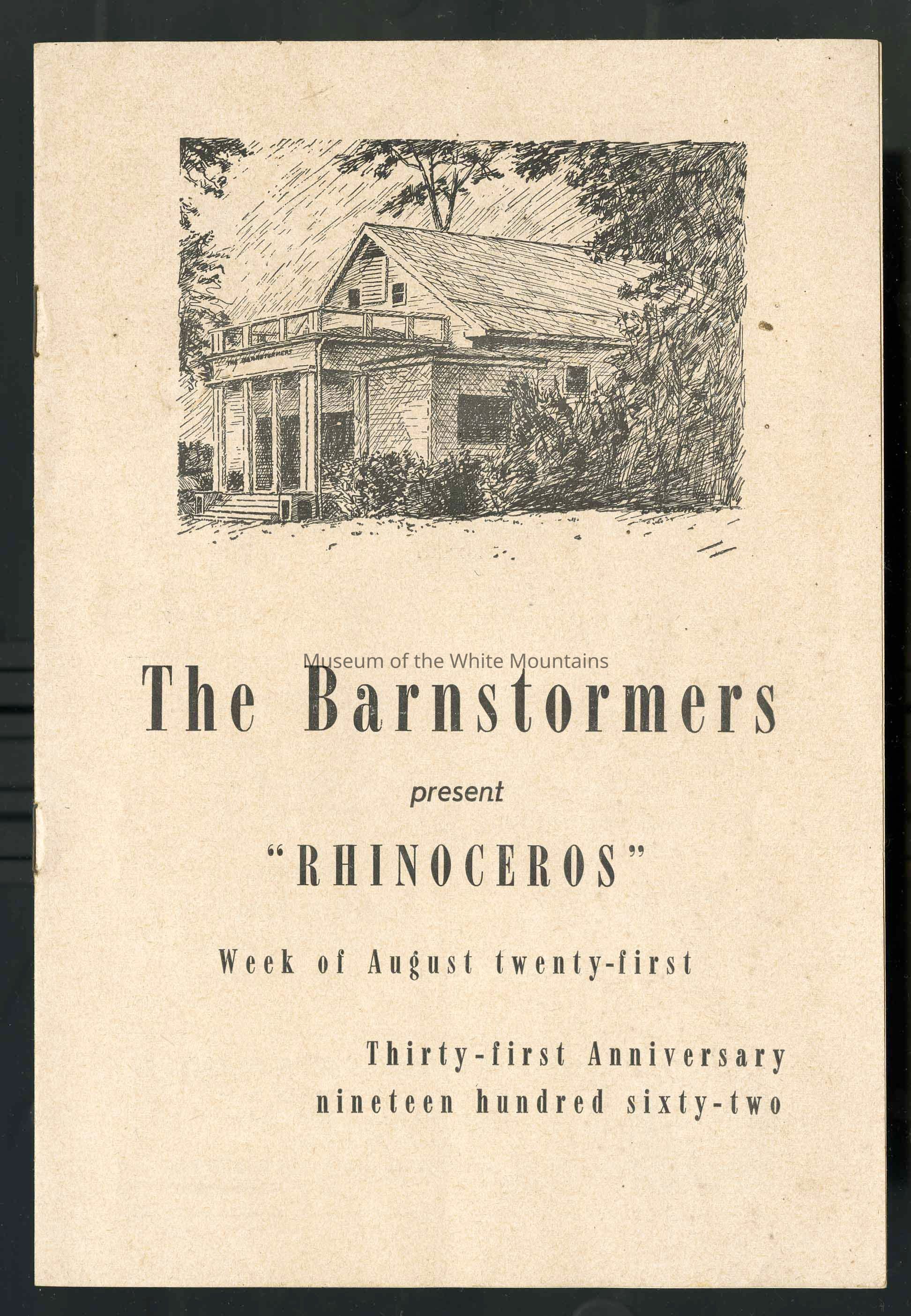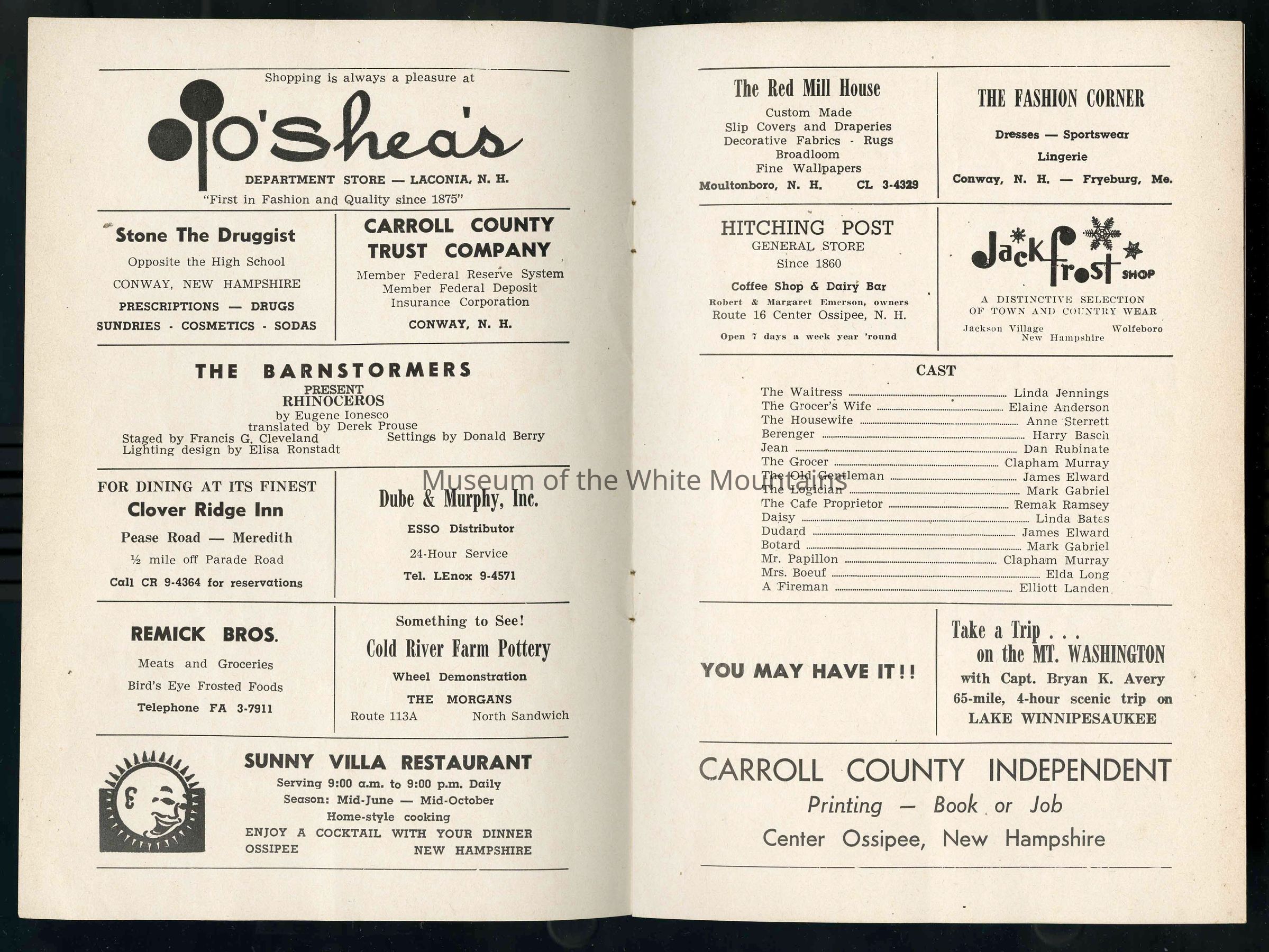 This is a Playbill for a show called "Rhinoceros," put on by The Barnstormers. It holds a lot of adds for local shops in the northern NH region. After the play, patrons are invited to head across the street to the Tamworth Inn for dinner and refreshments.Collection