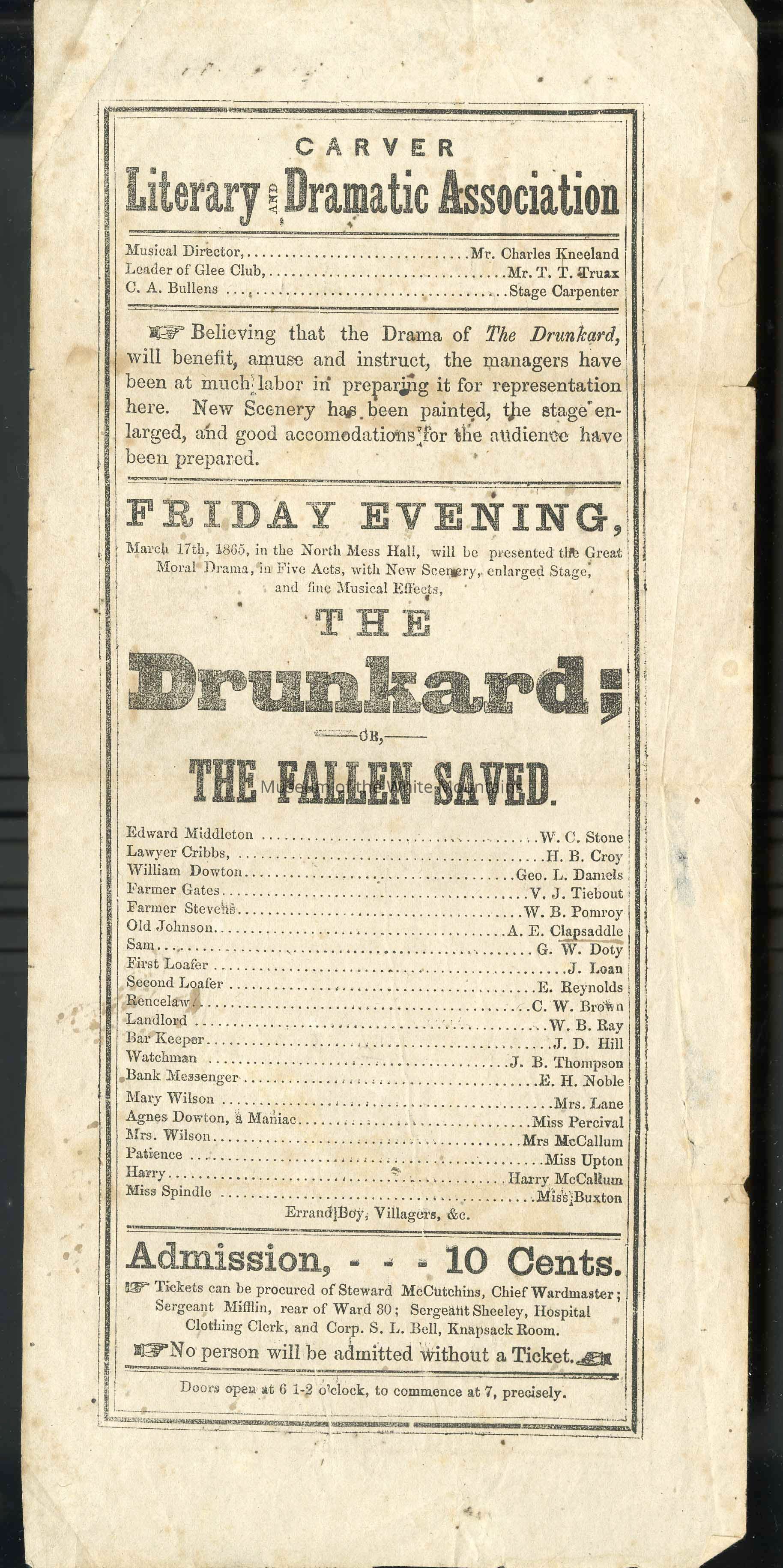 This item is a handbill for a play called "The Drunkard or the Fallen Saved," that was to take place on March 17, 1865. It contains the cast list, and price of admission (10 cents). Presented by the Carver Literary & Dramatic Association in the North Mess Hall [possibly in North Conway?]Collection