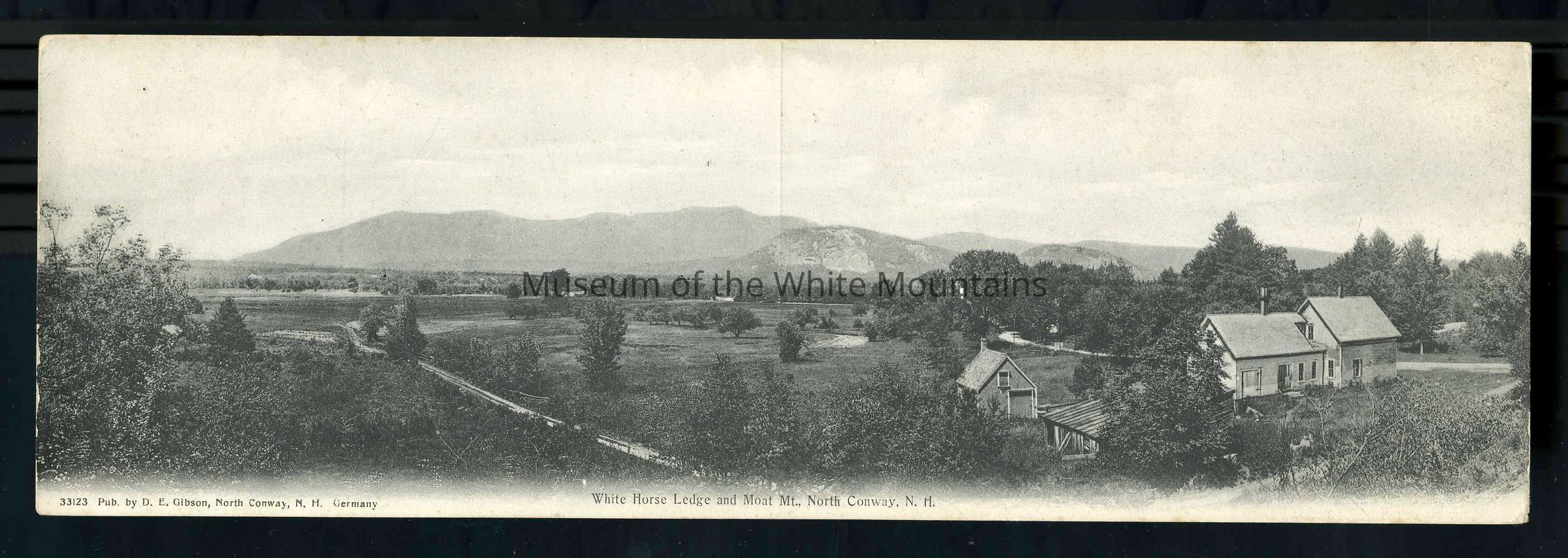 Oversize folded postcard features a black and white view of White Horse Ledge and Moat Mt., North Conway, N.H. In the foreground is a white farm house with several small barns behind it, fields dotted with trees, and two dirt roads that lead towards the mountain. Published by D.E. Gibson, North Conway, N.H. Germany.Collection