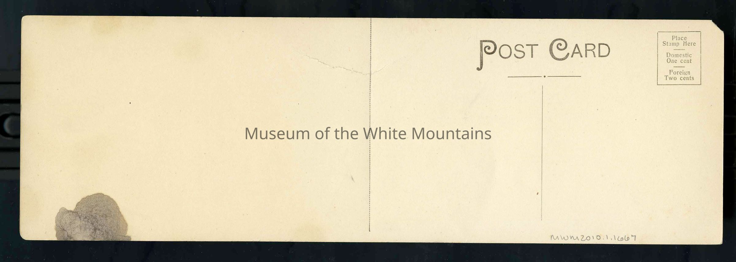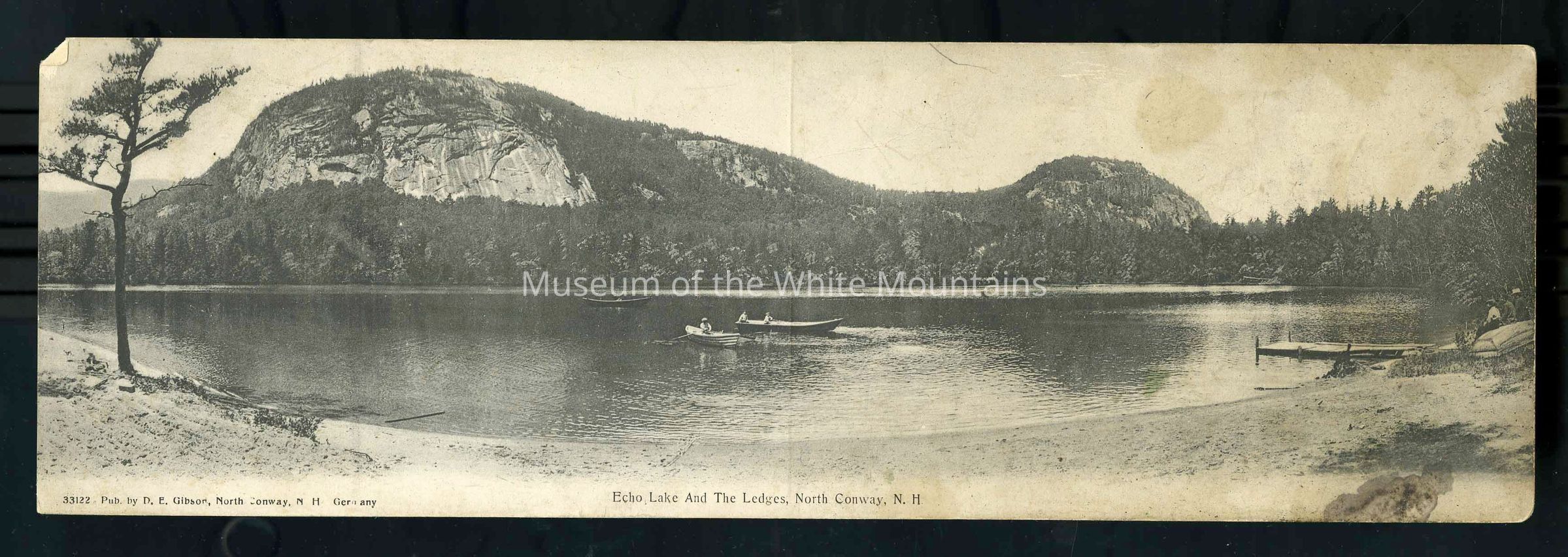 Oversize folded postcard depicting Echo Lake and White Horse Ledge in North Conway. In the foreground is a sandy beach with a dock on the right and one tree on the left. In the lake are three boats, with several people in each boat, rowing. On the right, three people are seen sitting on an overturned row boat on the beach behind the dock. Published by D.E. Gibson, North Conway, N.H. Germany.Collection
