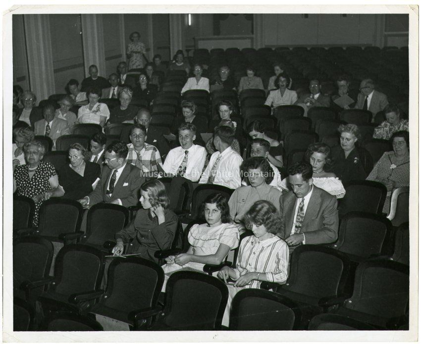 Photograph of adults and children gathered in a theater at the Balsams Hotel.