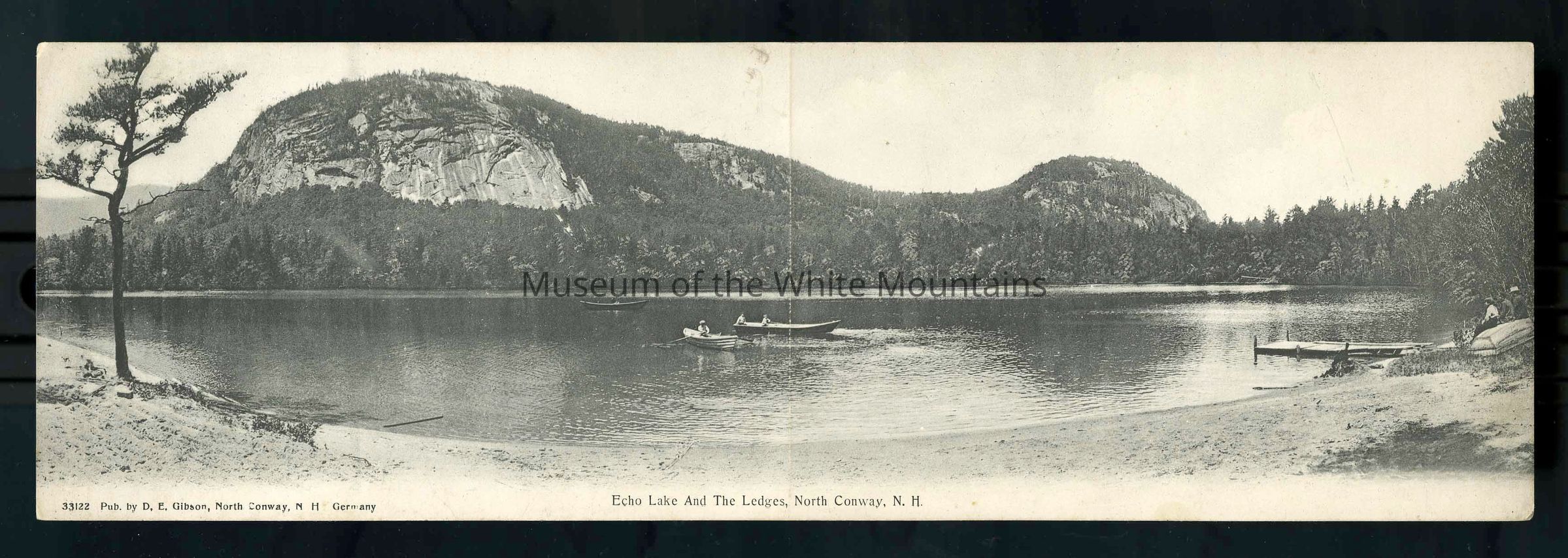 Oversize folded postcard depicting Echo Lake and White Horse Ledge in North Conway. In the foreground is a sandy beach with a dock on the right and one tree on the left. In the lake are three boats, with several people in each boat, rowing. On the right, three people are seen sitting on an overturned row boat on the beach behind the dock. Published by D.E. Gibson, North Conway, N.H. Germany.Collection