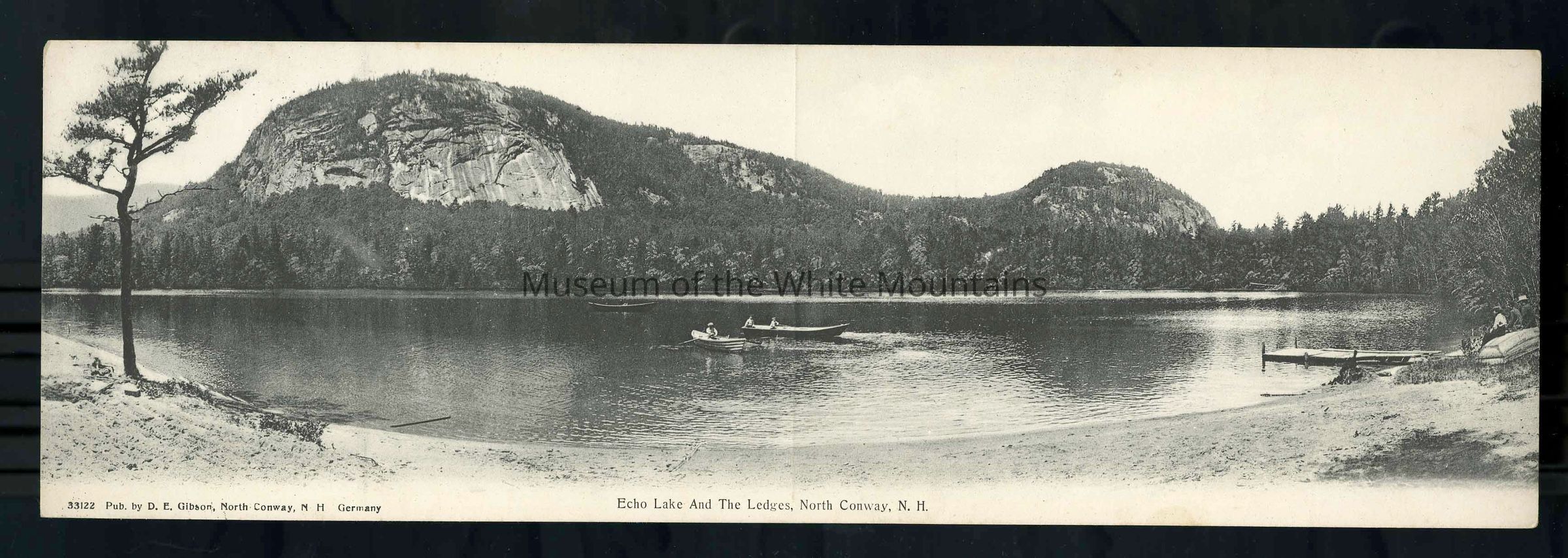 Oversize folded postcard depicting Echo Lake and White Horse Ledge in North Conway. In the foreground is a sandy beach with a dock on the right and one tree on the left. In the lake are three boats, with several people in each boat, rowing. On the right, three people are seen sitting on an overturned row boat on the beach behind the dock. Published by D.E. Gibson, North Conway, N.H. Germany.Collection
