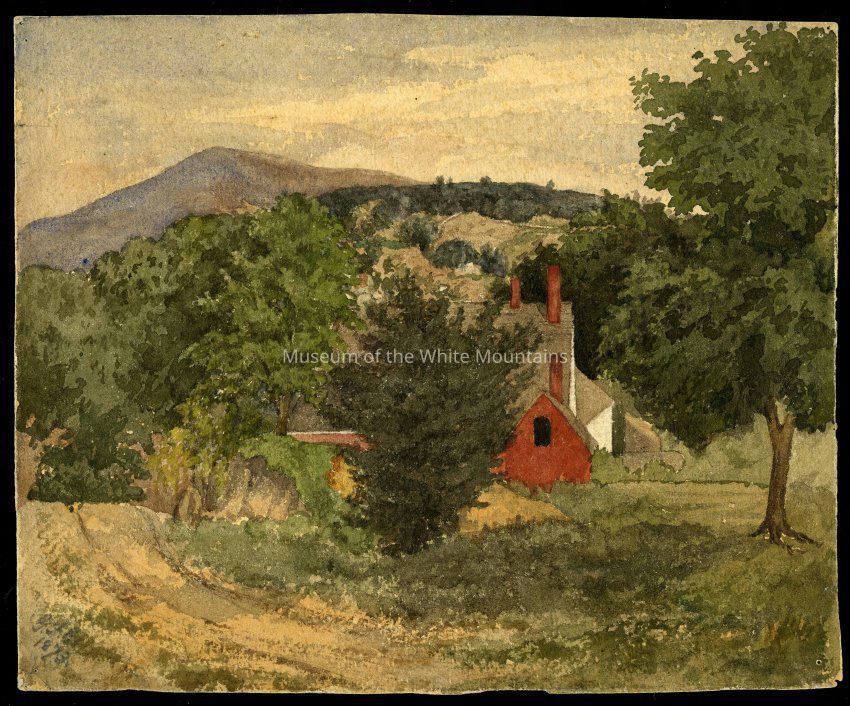This item is a watercolor painting by an unknown artist. It depicts a mountain scene and hidden in the trees is a white and red house, possibly a farm and small dirt road.Collection