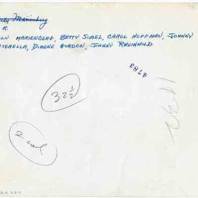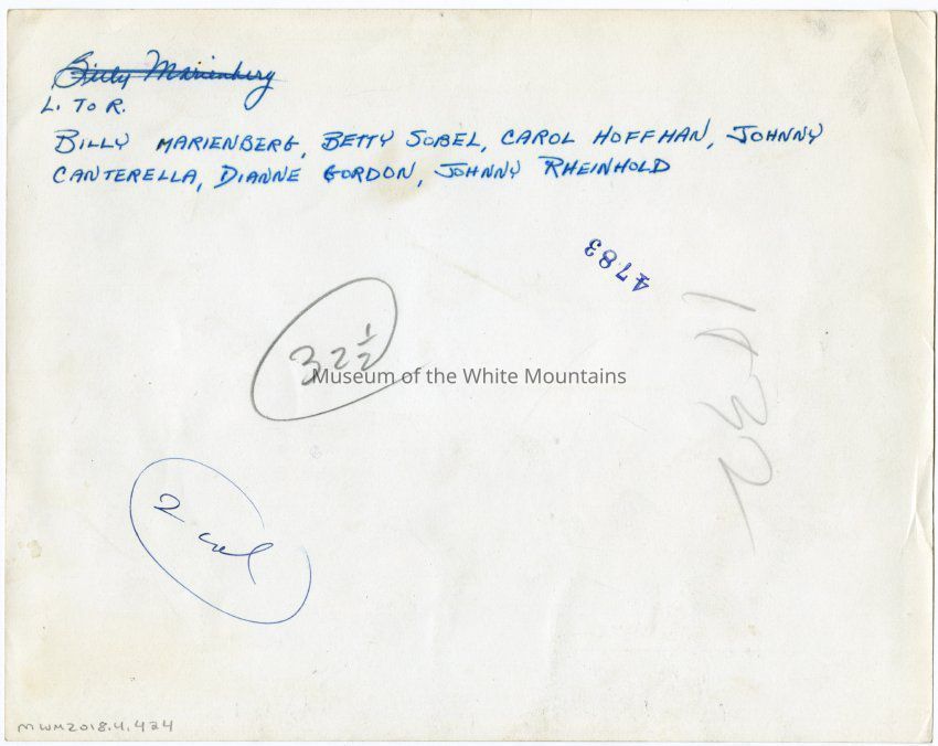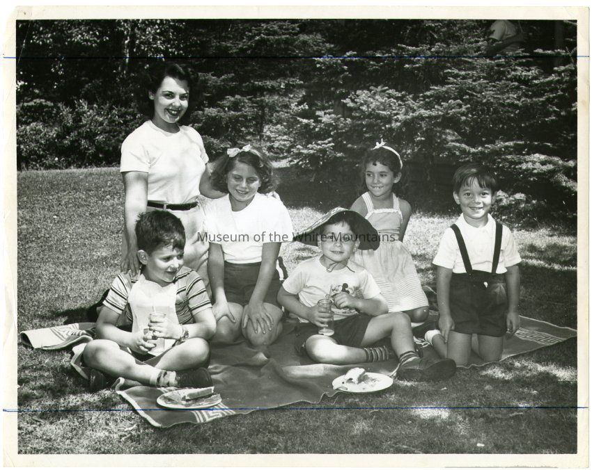Photograph of a group of children and a woman sitting on a blanket in the grass at the Balsams Hotel. From left to right: Billy Marienberg, Betty Sobel, Carol Hoffman, Johnny Canterella, Dianne Gordon, and Johnny Rheinhold. Most likely the children of guests and their babysitter.Acquisition
