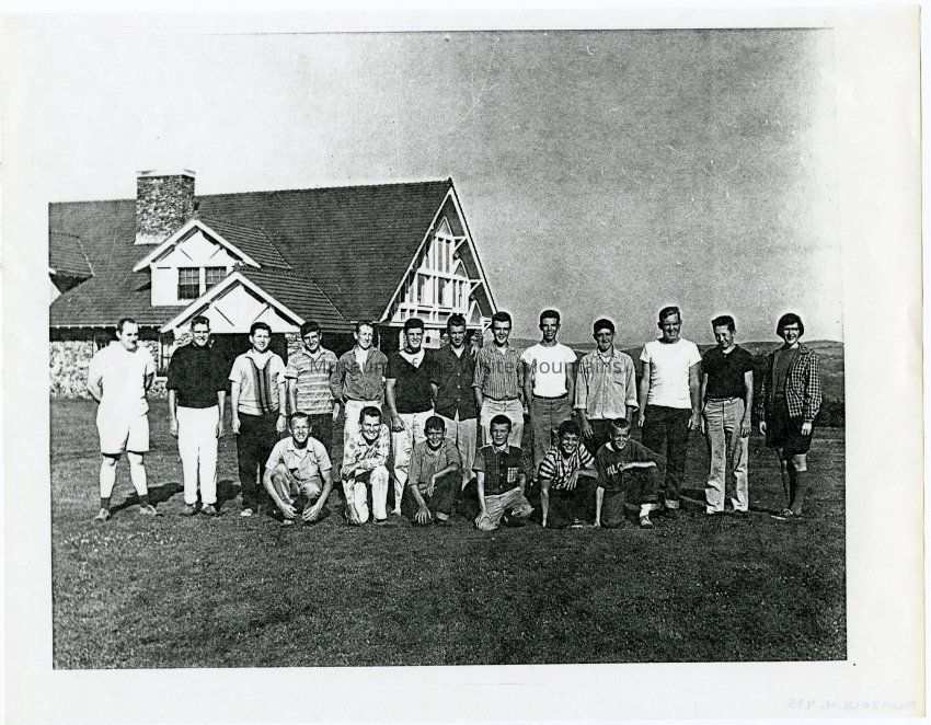 Photograph of a group of people standing in front of the clubhouse at The Balsams Hotel. Most likely they are members of the Caddy Camp. Xeroxed copy.