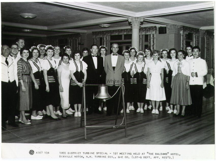 Photograph of the first meeting of the District Turbine Special at the Balsams Hotel, 1955. Members of the group pose with waitresses in the hotel's dining room.