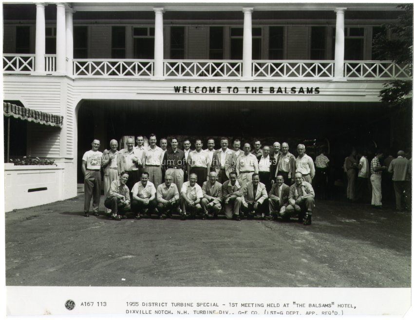 Photograph of the first meeting of the District Turbine Special at the Balsams Hotel, 1955. Members of the group pose together outside underneath a "Welcome to the Balsams" sign.