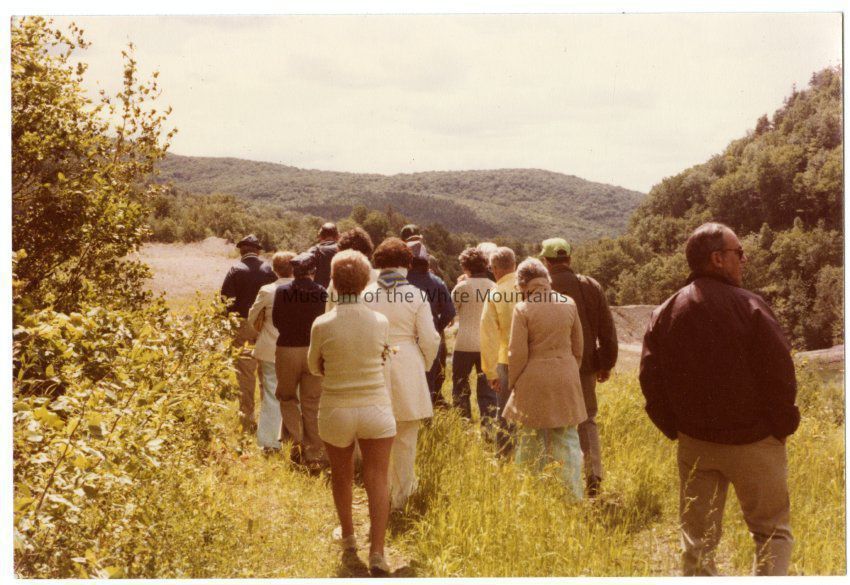 Color photograph of a group of people walking on a foot path through Dixville Notch, likely a group of hotel guests on a guided nature walk.