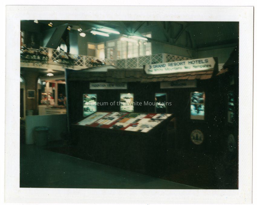 Color photograph of a display showing three grand resort hotels in the White Mountains of New Hampshire, including the Balsams Hotel.