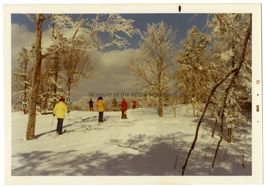 Color photograph of a group of people skiing in The Balsams Hotel ski area in March of 1972.
