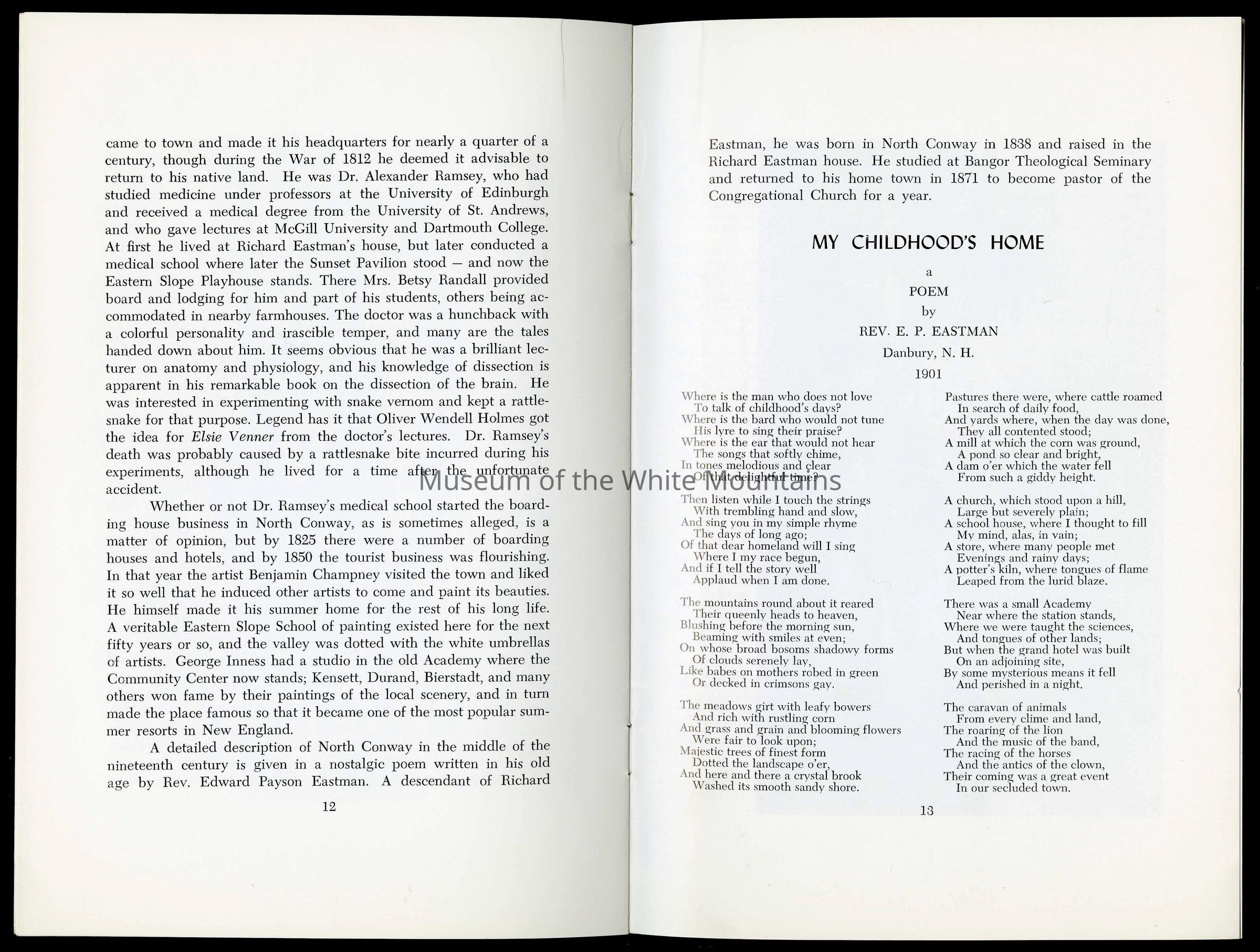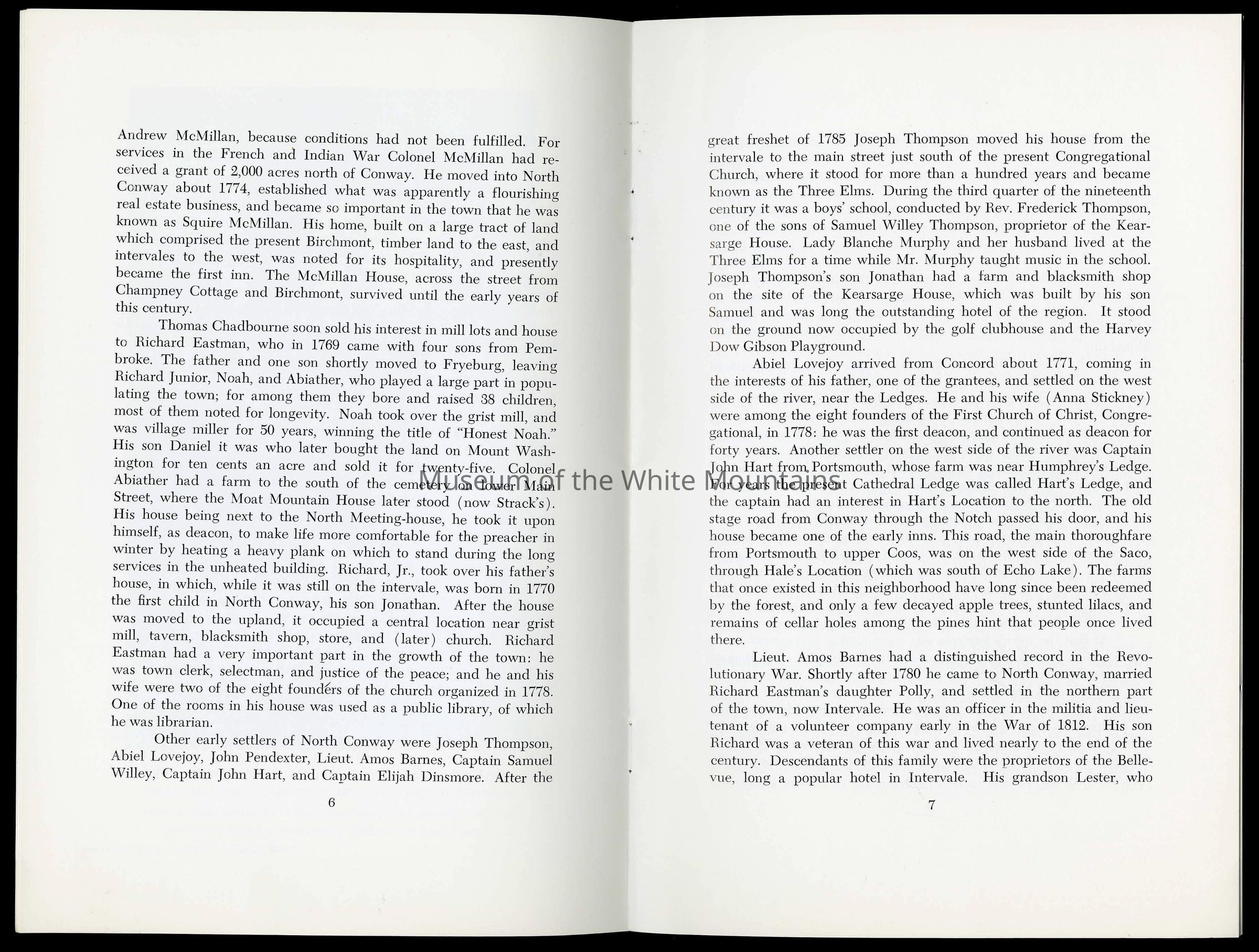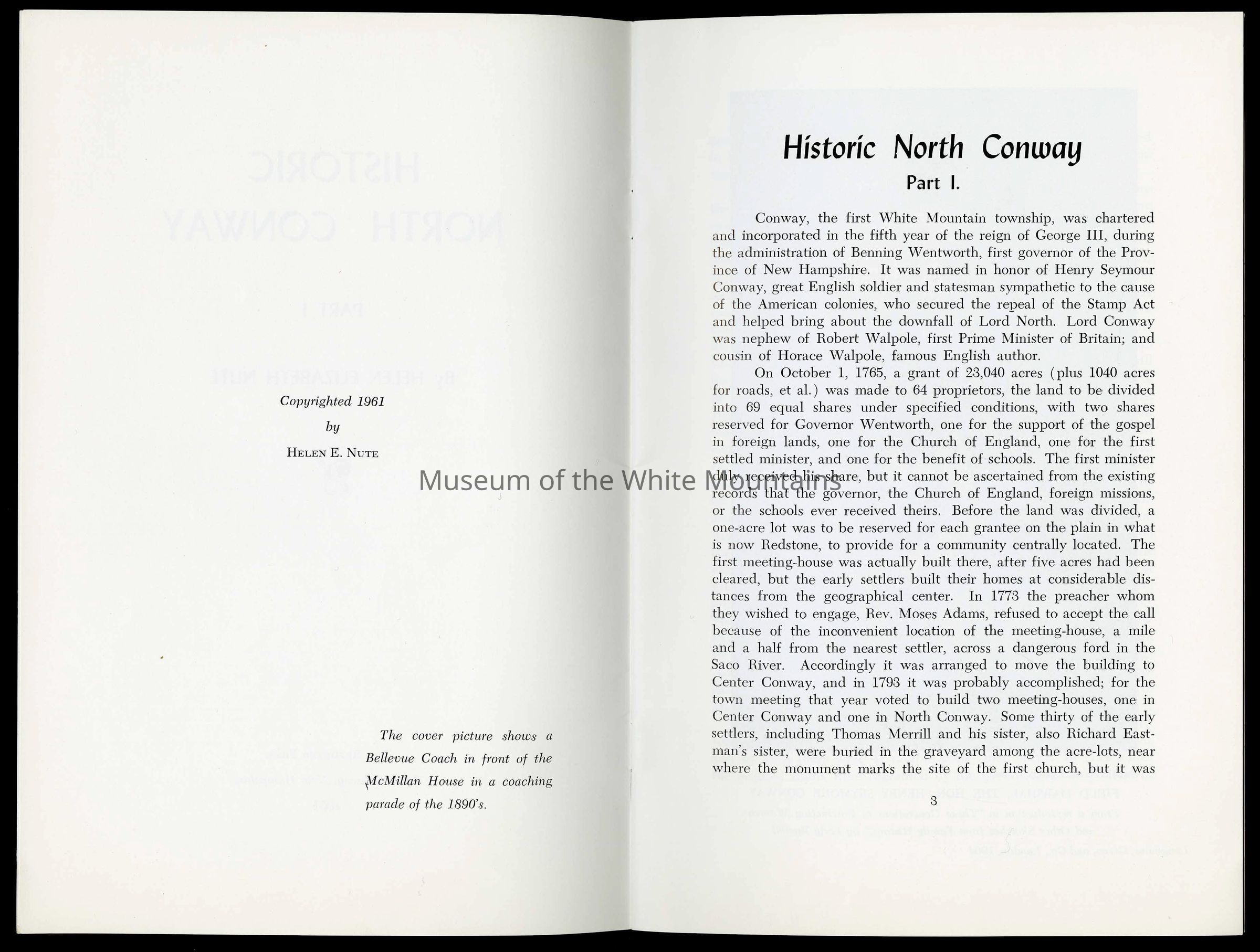 This item is an instructional phamphlet on Historic North Conway. It includes old paintings and images about North Conway, as well as poems and a brief history. This is Part 1 of an unknown amount of parts.Collection