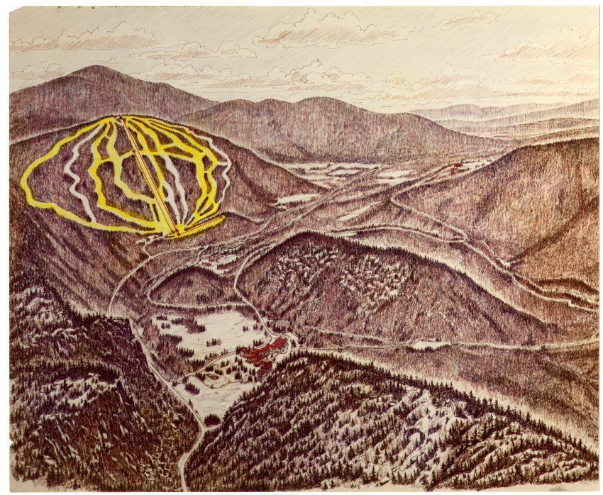 Color photograph of Dixville Notch with ski trails highlighted in yellow.