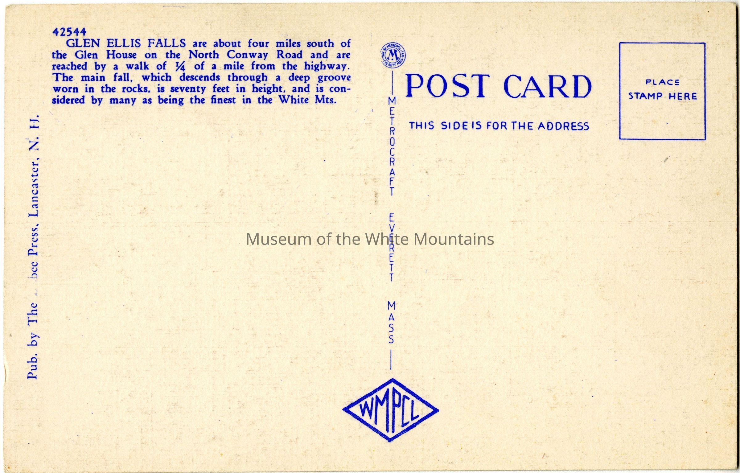 Divided back contains no writing and a brief description of the front's subject: "GLEN ELLIS FALLS are about four miles south of the Glen House on the North Conway Road and are reached by a walk of 1/4 of a mile from the highway. The main fall, which descends through a deep groove worn in the rocks, is seventy feet in height, and is considered by many as being the finest in the White Mts.