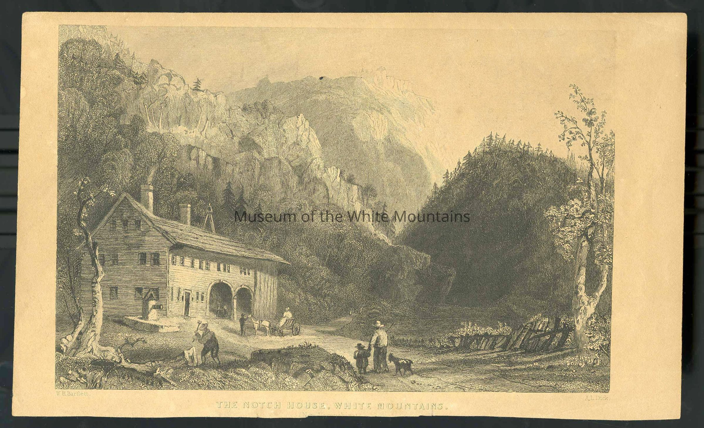 Black and white lithograph done by William Henry Bartlett and the engraving was done by A.L. Dick. It depicts the Notch House in the White Mountains. In front of the house there are people working to chop wood, feed horses and walking with a small child and goat.
