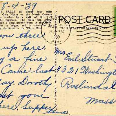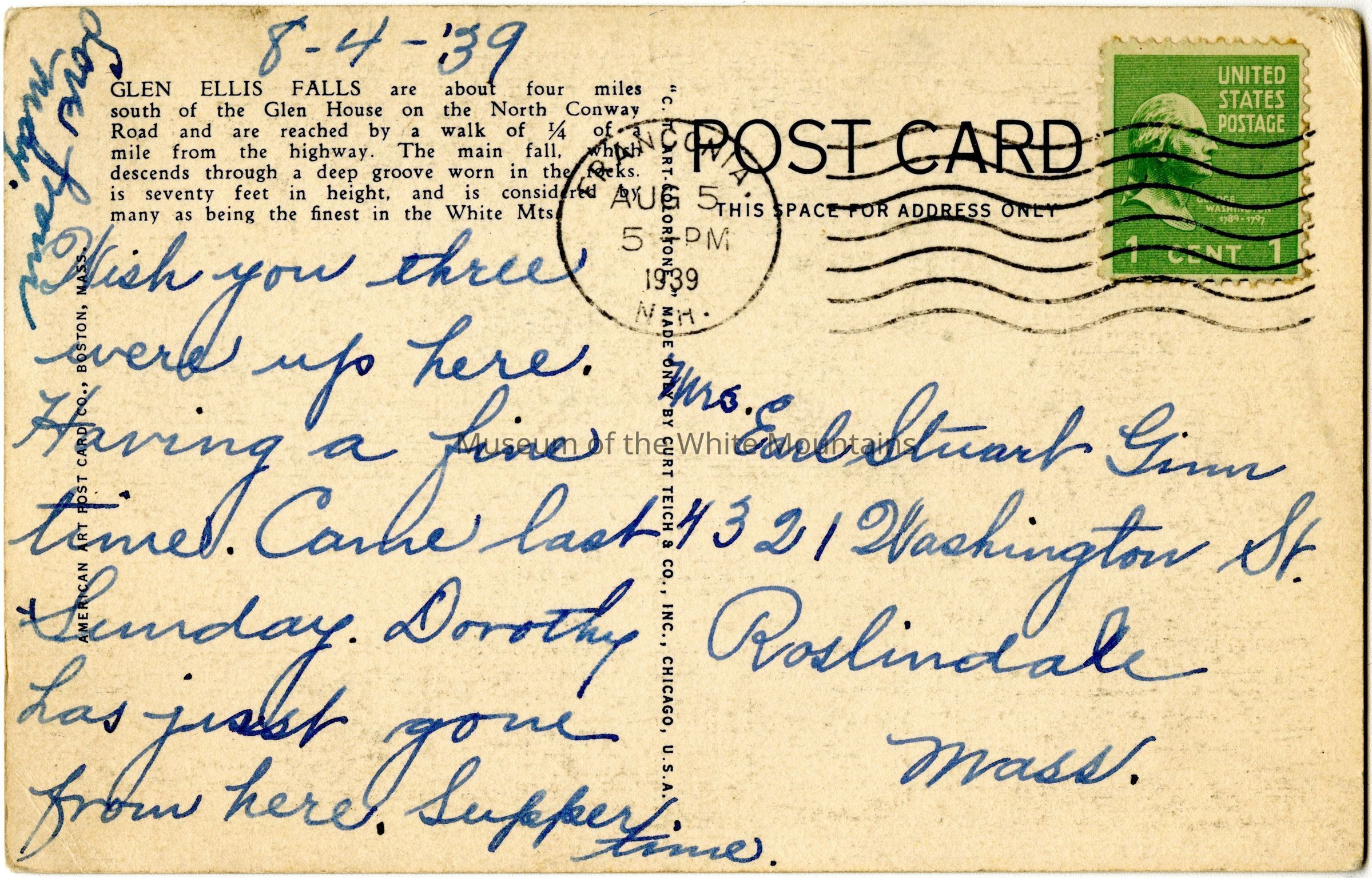 Divided back with hand-written message and a brief description of the postcard front's subject: FLEN ELLIS FALLS are about four miles south of the Glen House on the North Conway Road and are reached by a walk of 1/4 of a mile from the highway. The main fall, which descends through a deep groove worn in the rocks is seventy feet in height, and is considered by many as being the finest in the White Mts.