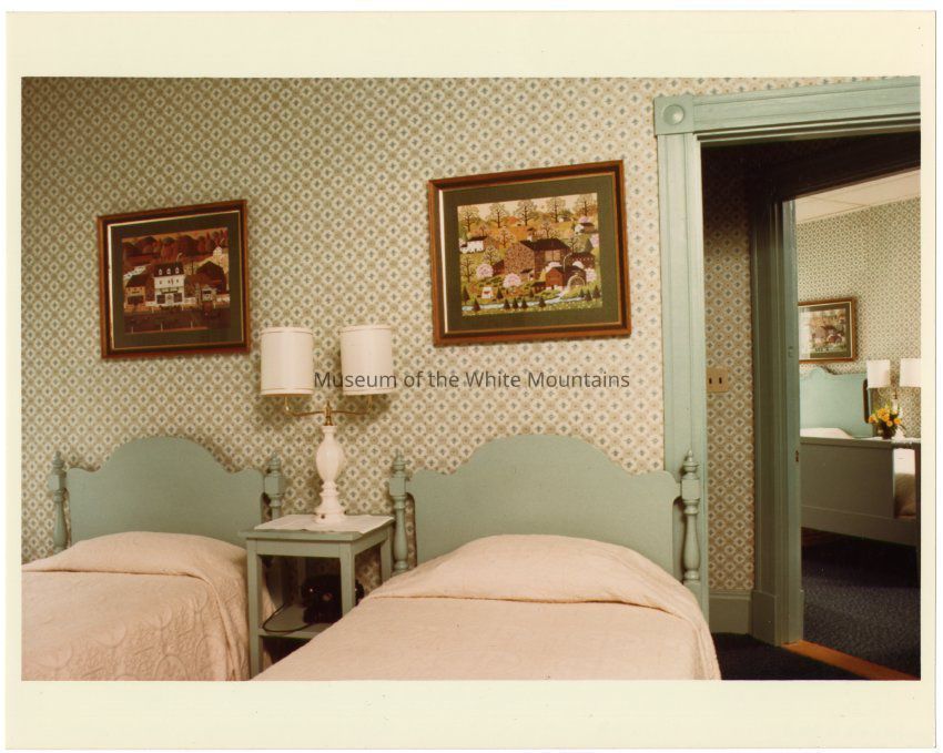 Color photograph of a bedroom at the Balsams Hotel.