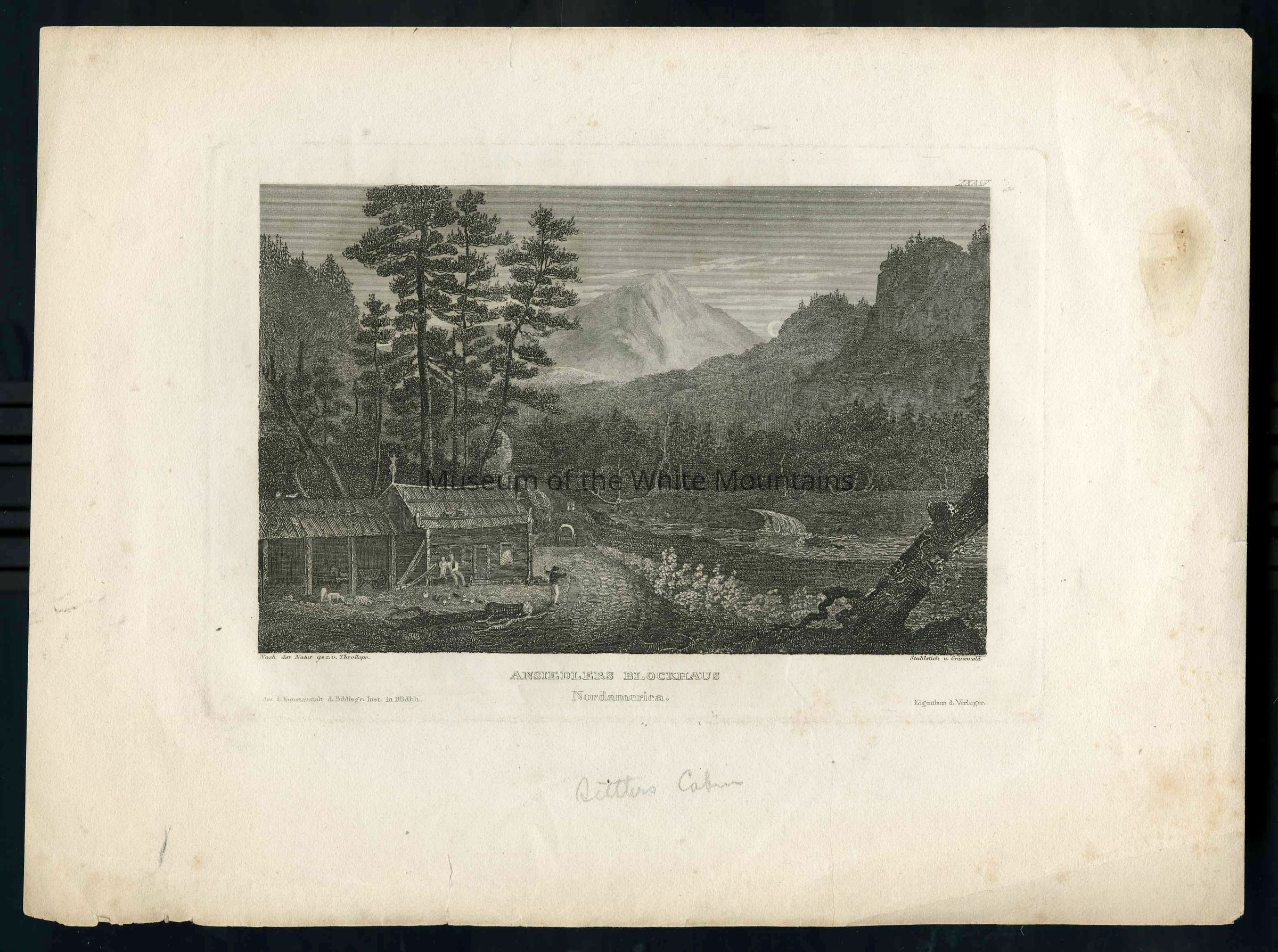 This item is a German etching. The title translates to Settler Log Cabin in North America. It depicts a cabin beside a river in the woods. Several people and farm animals are gathered in front of the cabin. There is a mountain in the background.