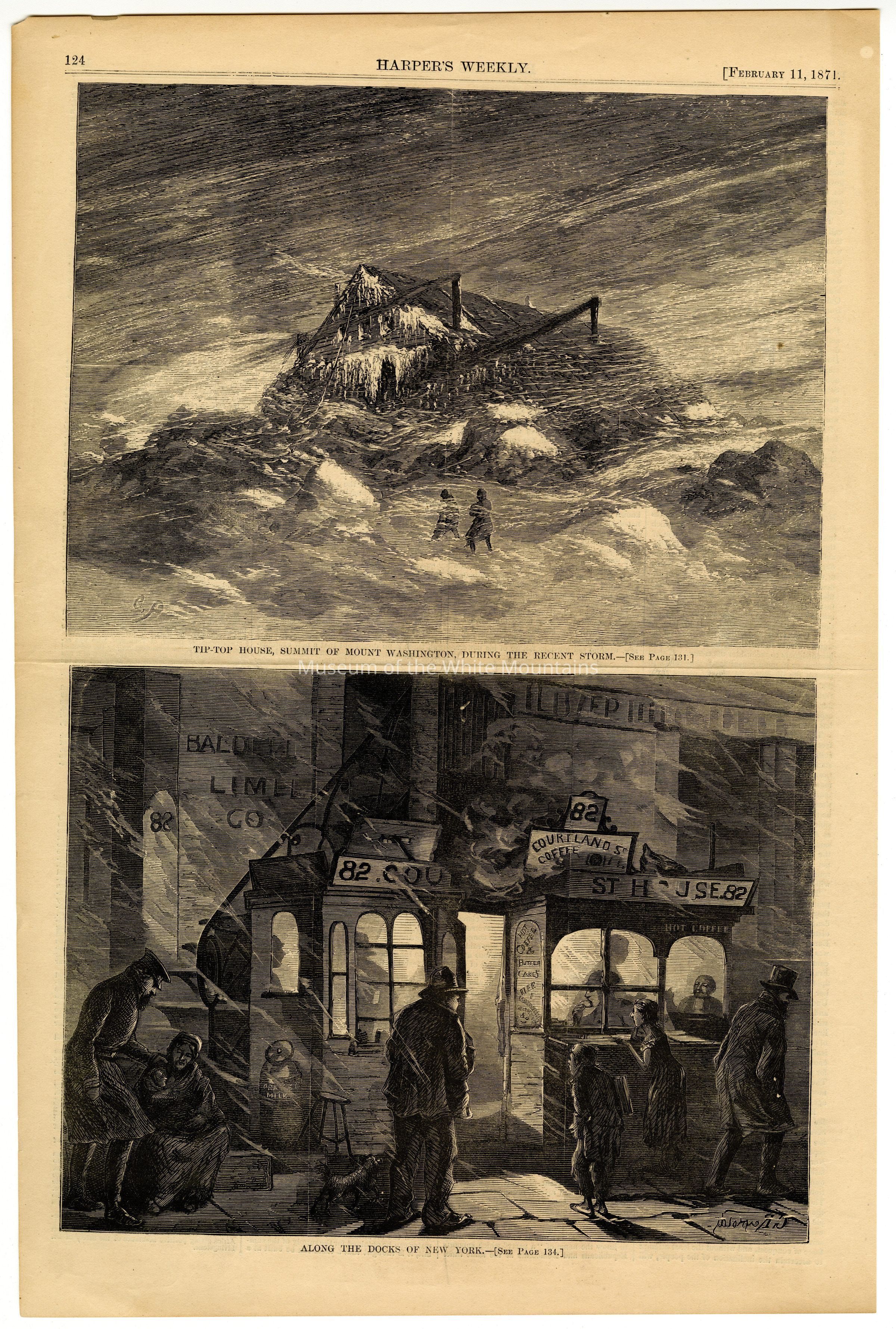 A page from Harper's Weekly dated February 11, 1871. The front contains two engravings: On top, an engraving depicting Mount Washington's Tip Top House during a storm, the other, below, is of buildings near the docks of New York.Type of Print
