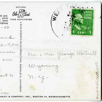 Transcription: 7-1-50, We have had a grand trip up. It is now 6:15pm + we are eating dinner about 10 mi. from our camping ground. Tomorrow we start to hike. Love, Elinor