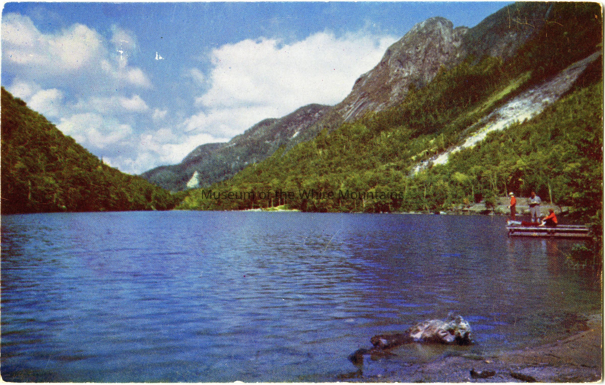 A post card containing an eye-level photograph of Profile Lake in Franconia Notch in which ~three people sit or stand on a dock. The photo is in color.