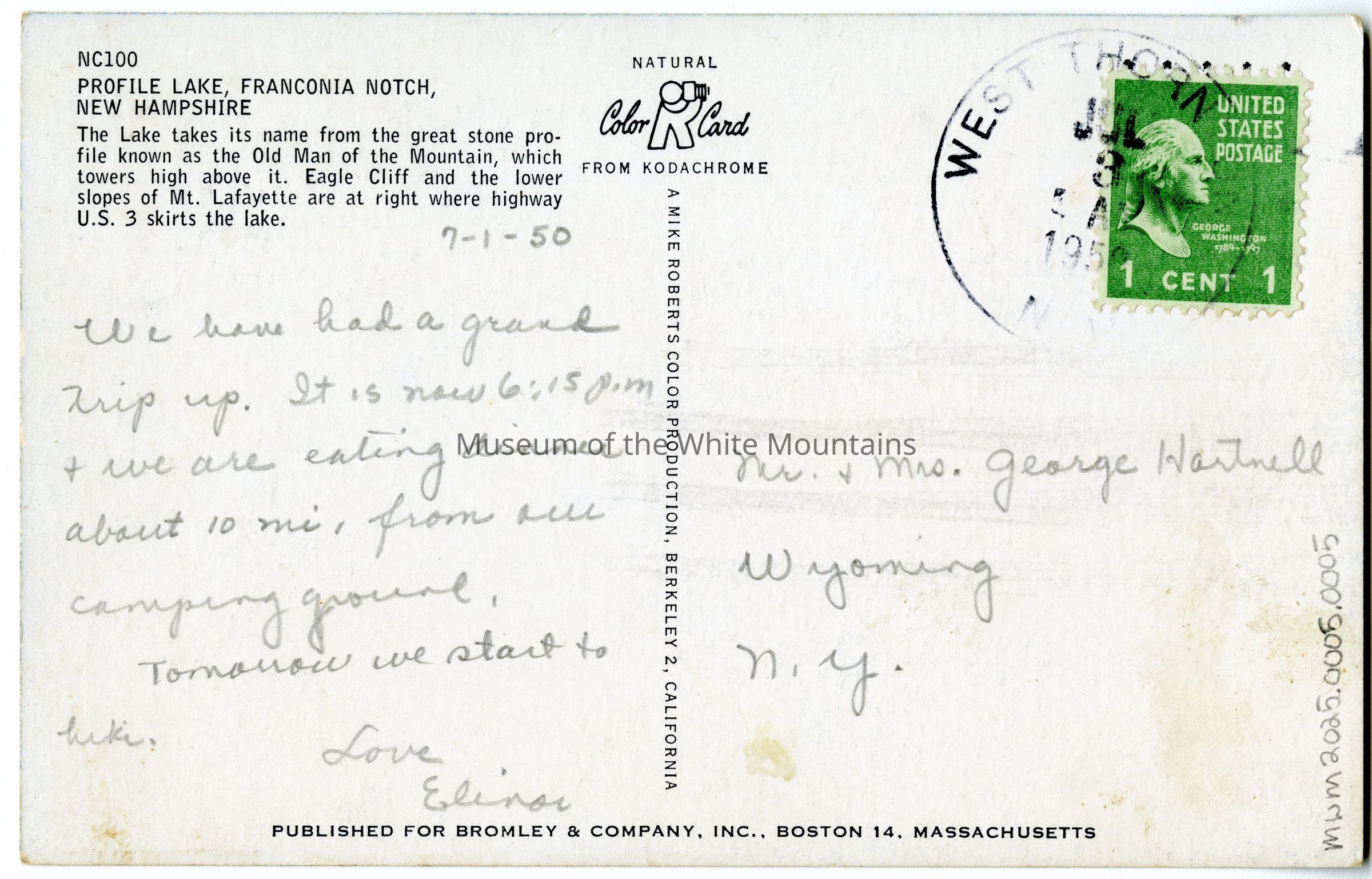 7-1-50, We have had a grand trip up. It is now 6:15pm + we are eating dinner about 10 mi. from our camping ground. Tomorrow we start to hike. Love, ElinorTranscriber