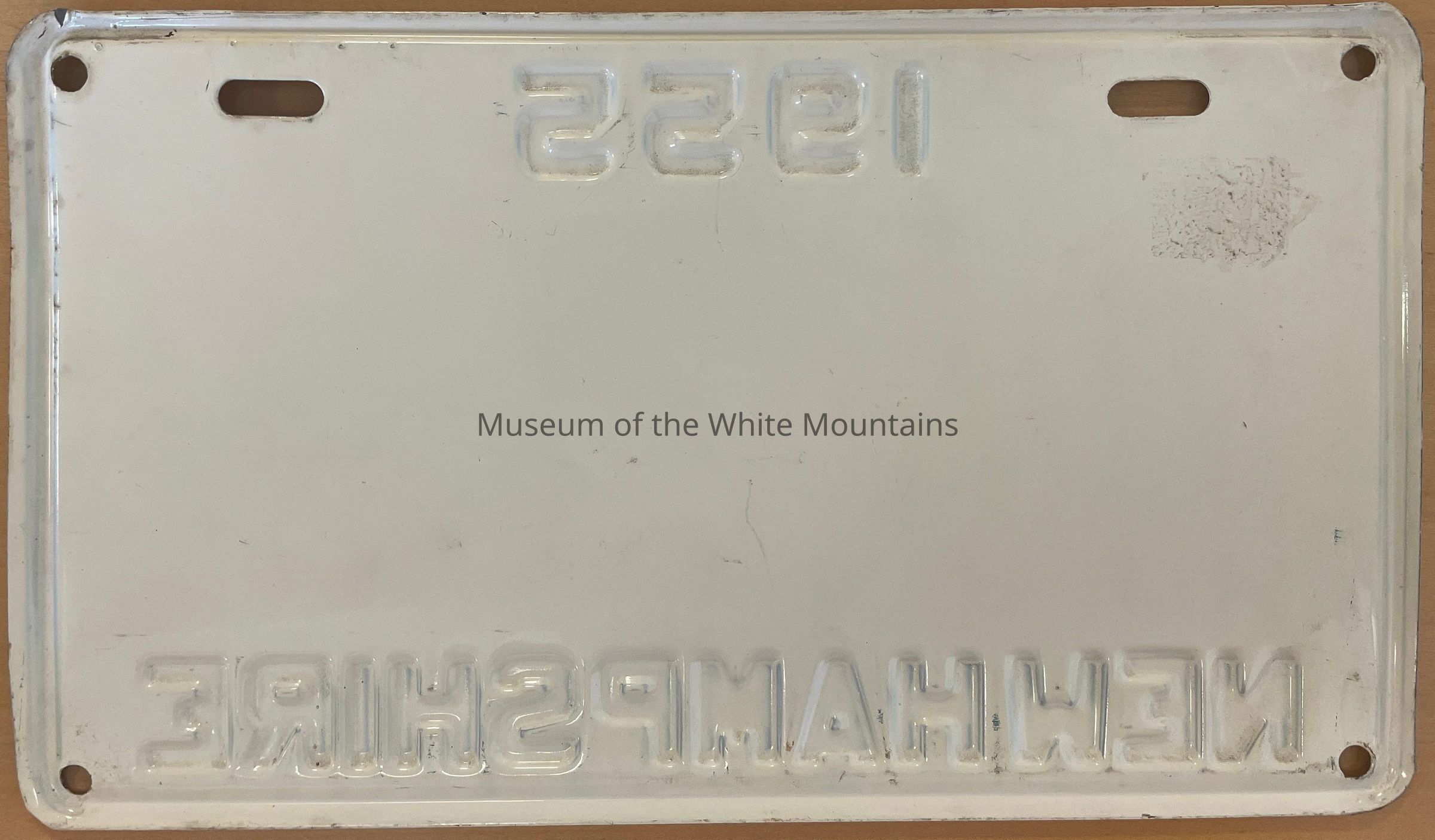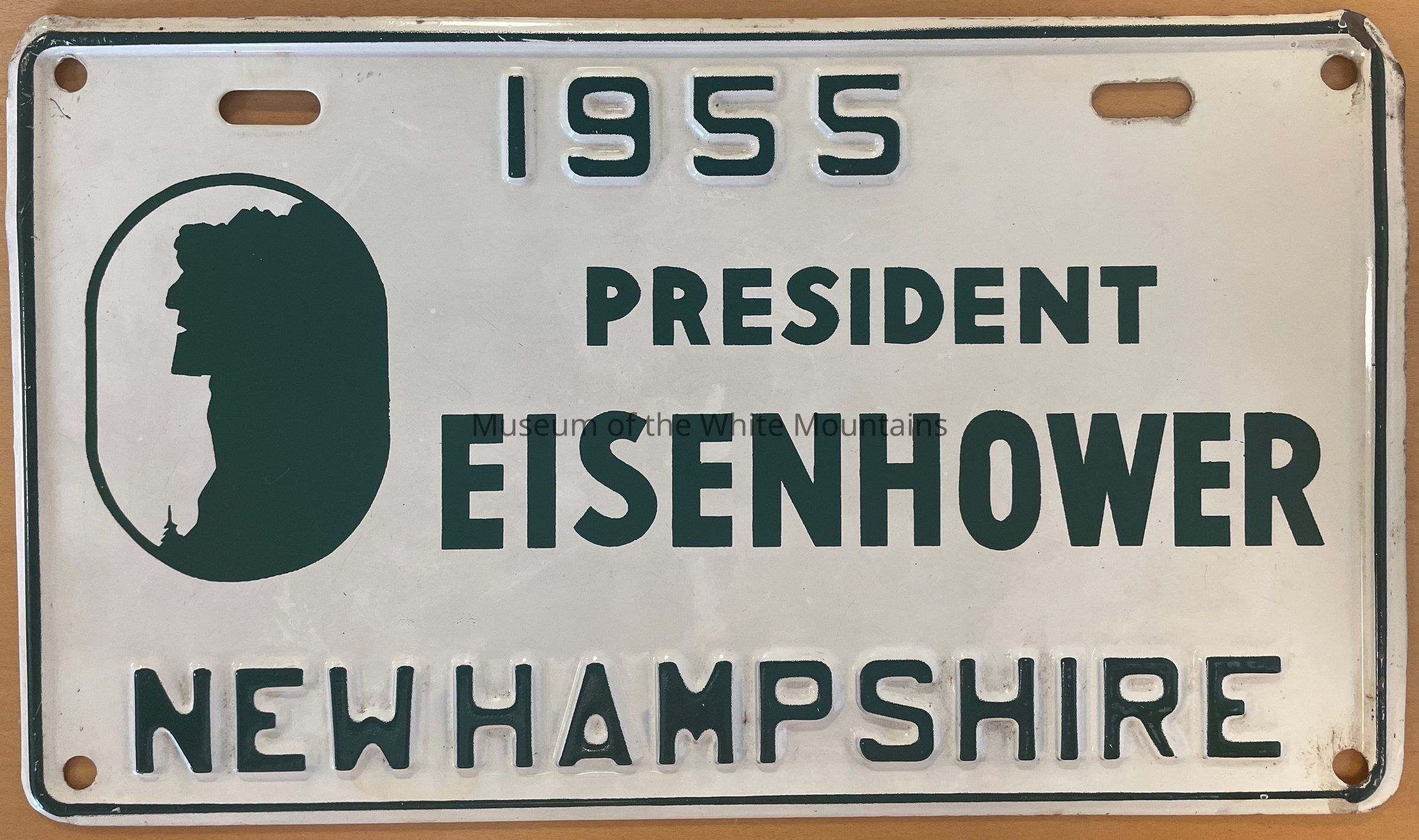 This is a New Hampshire automotive license plate commemorating the 1955 visit made by President Dwight Eisenhower in acknowledgement and celebration of the Old Man of the Mountain in Franconia Notch. The object features both the emblem of Old Man of the Mountain and the name of President Eisenhower prominently in the center of the plate in dark green lettering. The plate also featured the year of 1955 at the top with New Hampshire on the bottom of the plate.Context