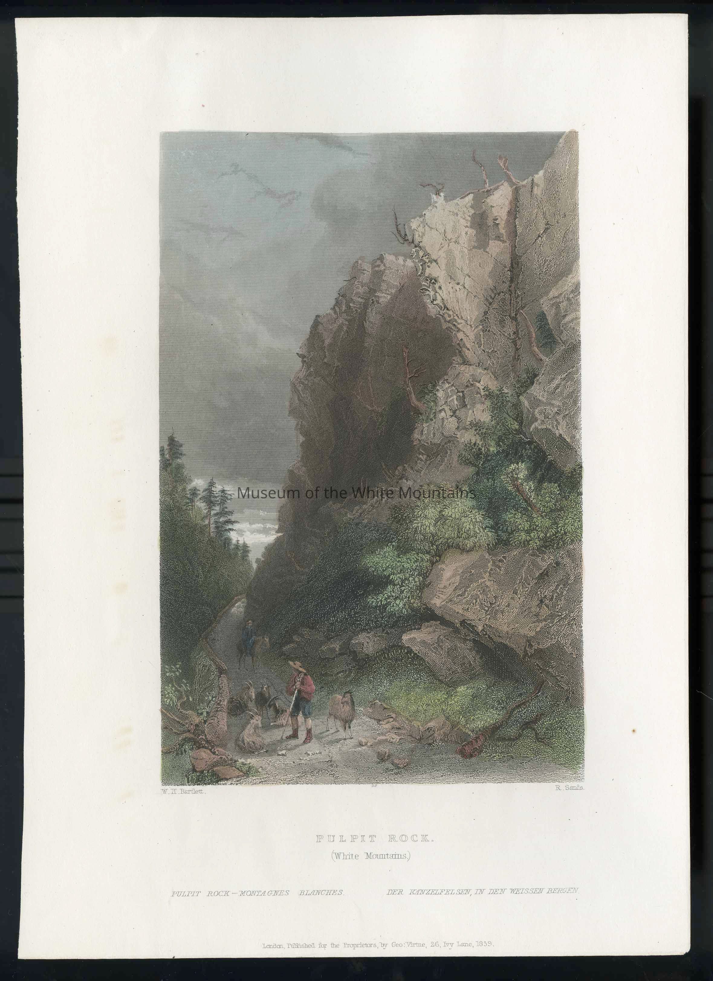 Color lithograph of Pulpit Rock, located in Bedford, NH, which is a lower section of the White Mountains. It features a man on horseback and a goat herder surrounded by his goats walking along a dirt path. The text on the etching is presented in English, French, and German. Printed on the bottom is "London, Published for the Proprietors, by Geo Virtue, 26, Ivy Lane, 1839."Collection