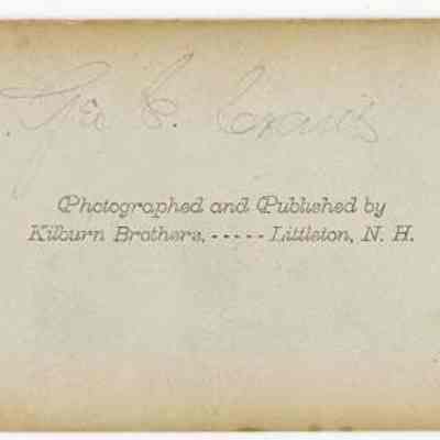 View of trees and mountains on a road at Dixville Notch. Has "GE K. Lanou" writing on the back. [Name is questionable due to legibility]