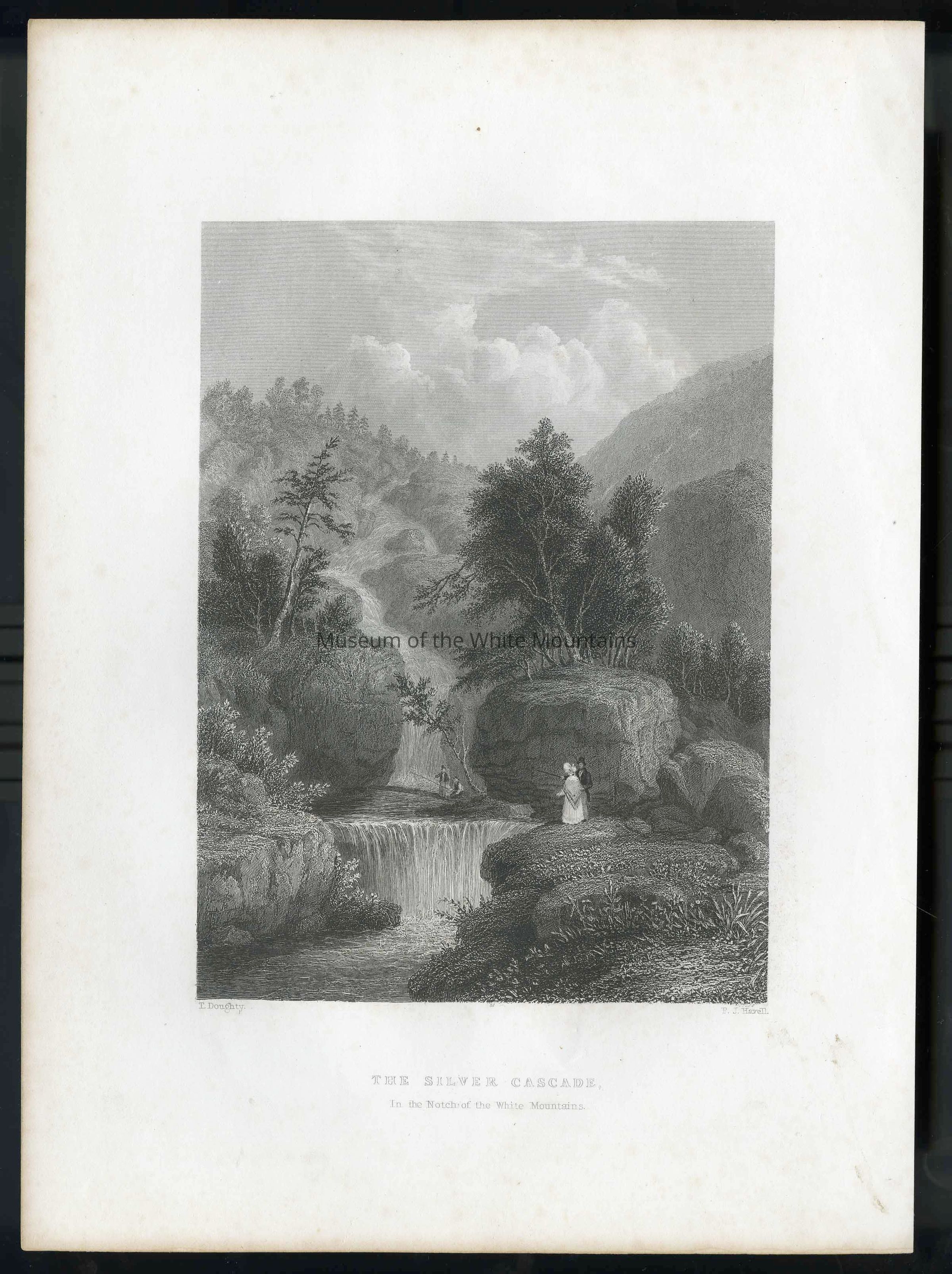 Black and white lithograph of the Silver Cascade falls in the White Mountains by Thomas Doughty. There are two possible dates for when this originally was printed and when it was possibly engraved (1839 through 1857). It features two men fishing at the river, and two tourists, a man and woman, standing at the edge of the falls.
