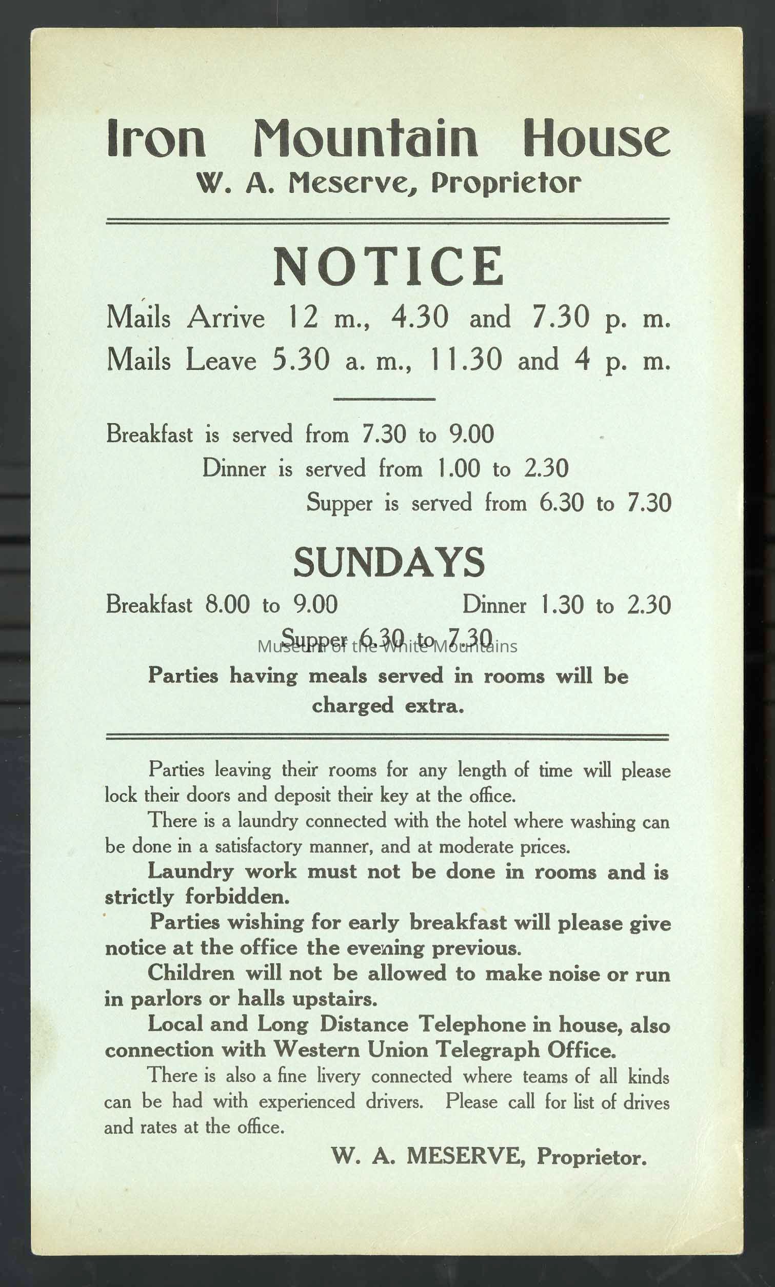 This item is a small brochure for the Iron Mountain House. It shows the times when the mail go out and comes in, as well as when the meal times are. It also has the general rules for a persons stay at the hotel.Collection